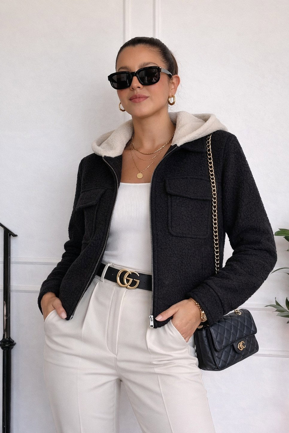 Esta campera está confeccionada en paño bucle, una tela con textura tipo rizada que aporta volumen, abrigo y un look moderno. Es ideal para media estación e invierno, combinando estilo y confort.