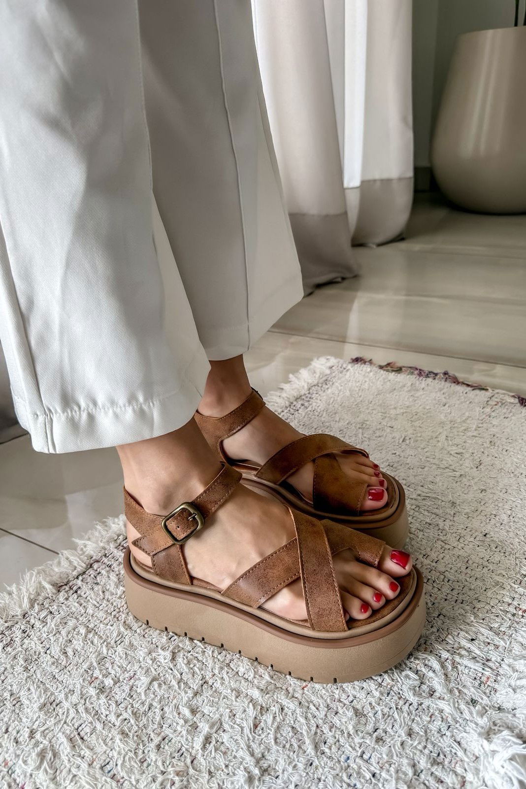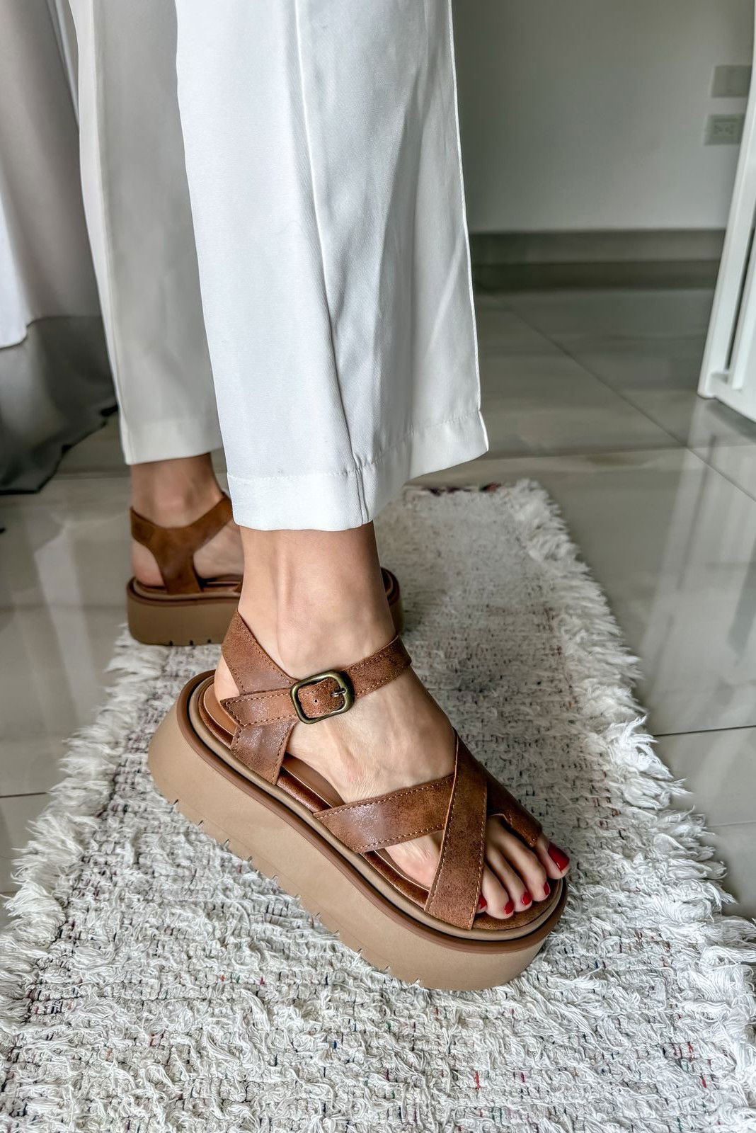 Material: Plataforma de ecocuero con capellada de faja cruzada y detalle en el pulgar, que asegura un calce firme y moderno.