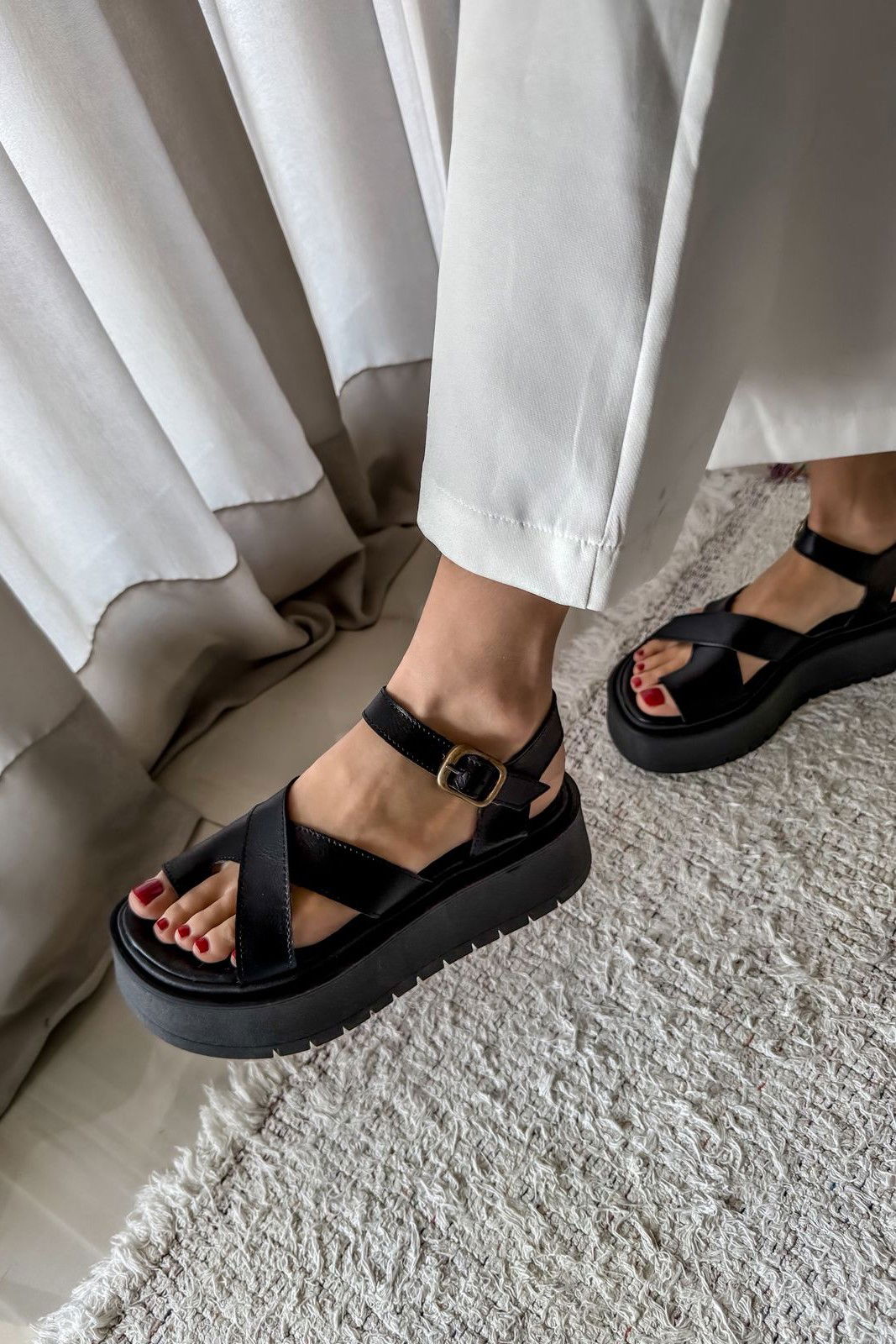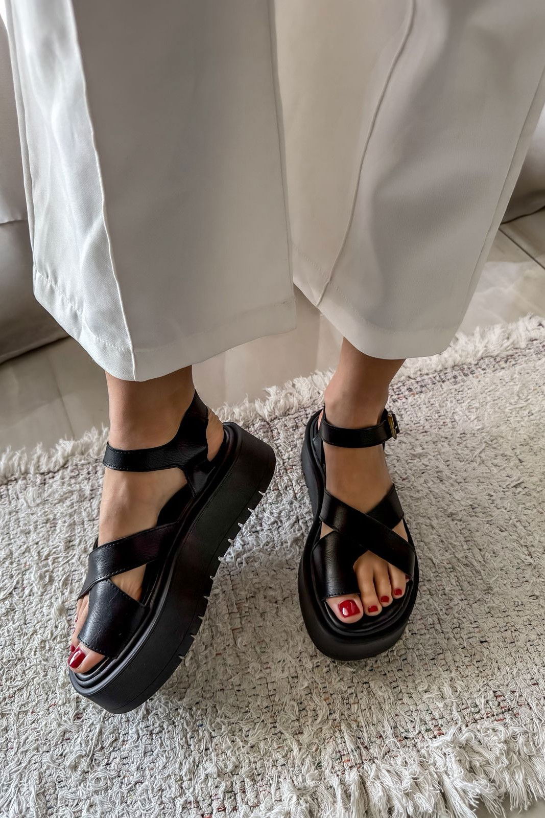 Material: Plataforma de ecocuero con capellada de faja cruzada y detalle en el pulgar, que asegura un calce firme y moderno.