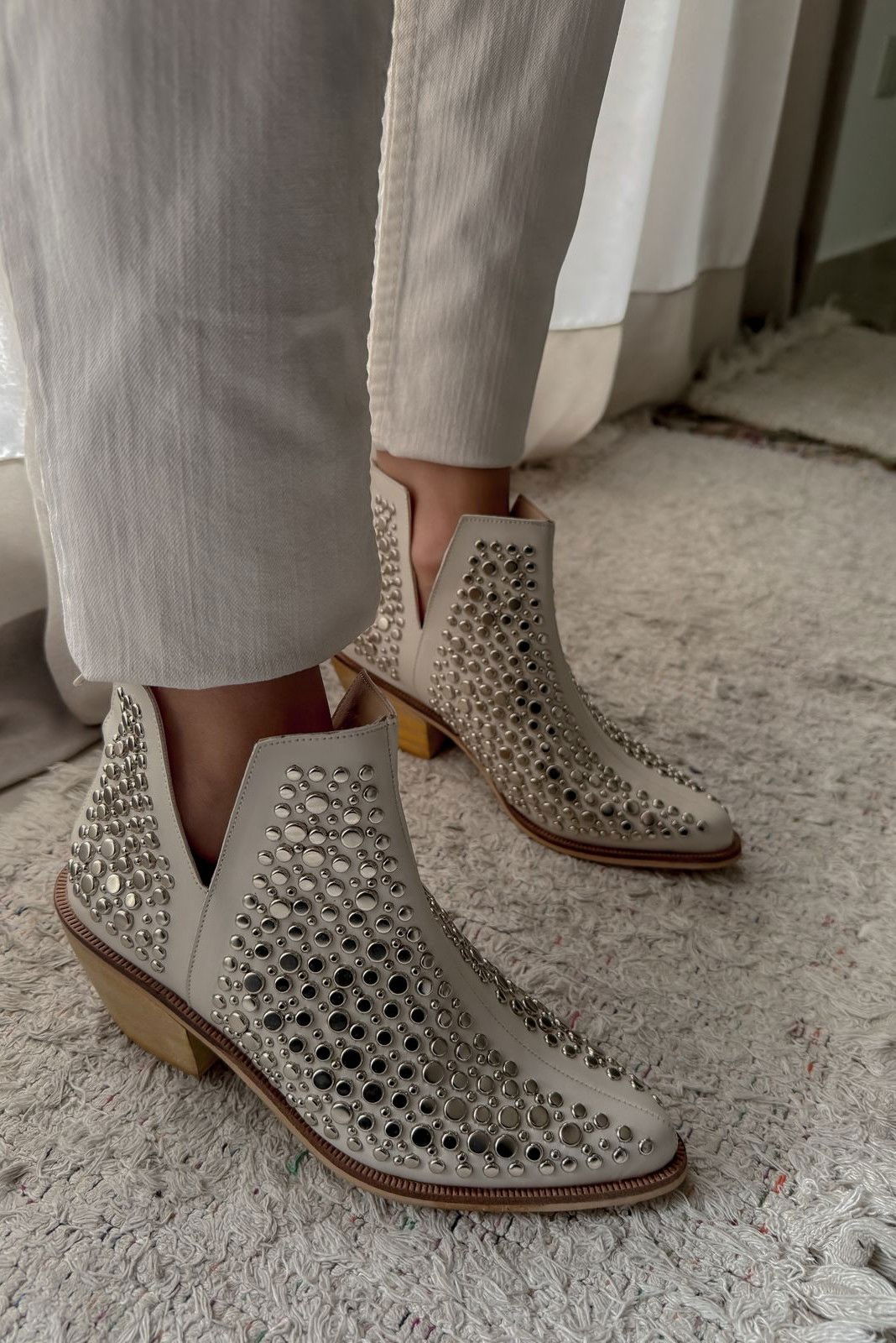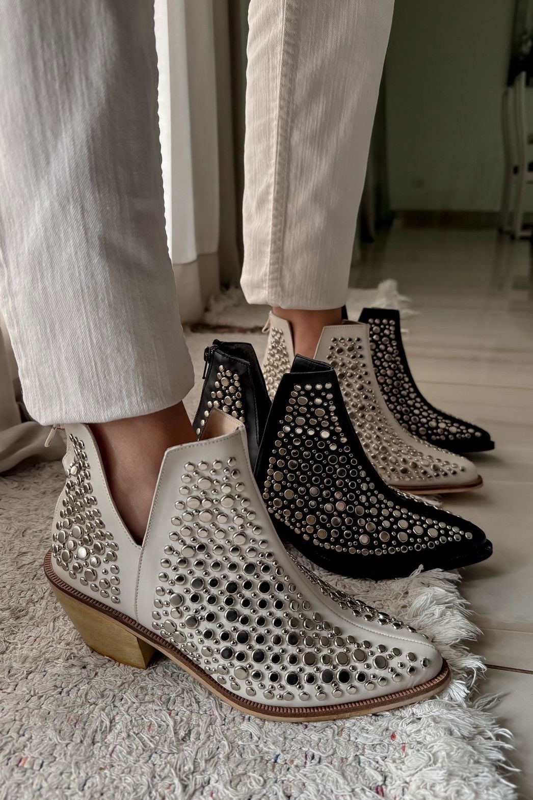 🎯 Diseño: caña baja con recorte lateral en “V”, puntera afinada y aplique de tachas metálicas en todo el talón y costados (fiel a la foto).