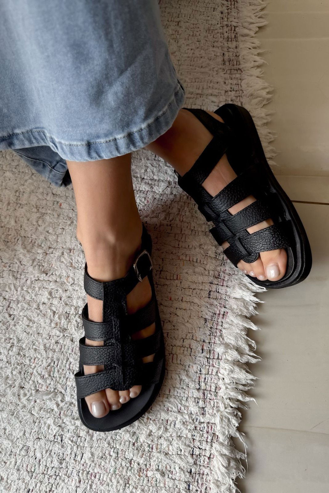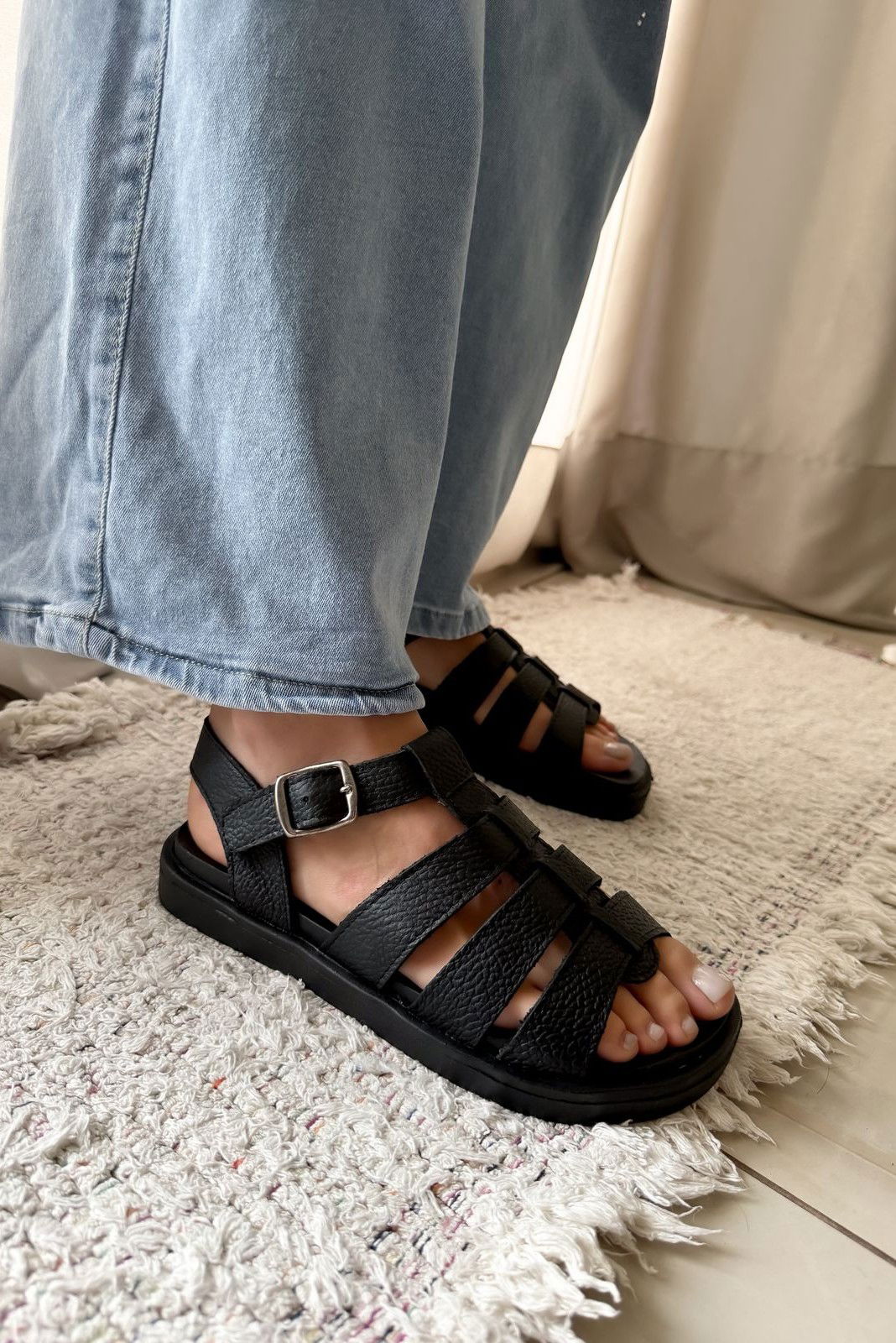 ▪︎ Fabricadas en 100% cuero veteado, su textura natural les da un acabado único y elegante, mientras que las tiras anchas aportan frescura y firmeza en cada paso. ▪︎ El detalle de la hebilla regulable en el talón asegura un calce perfecto y adaptado a tu pie.