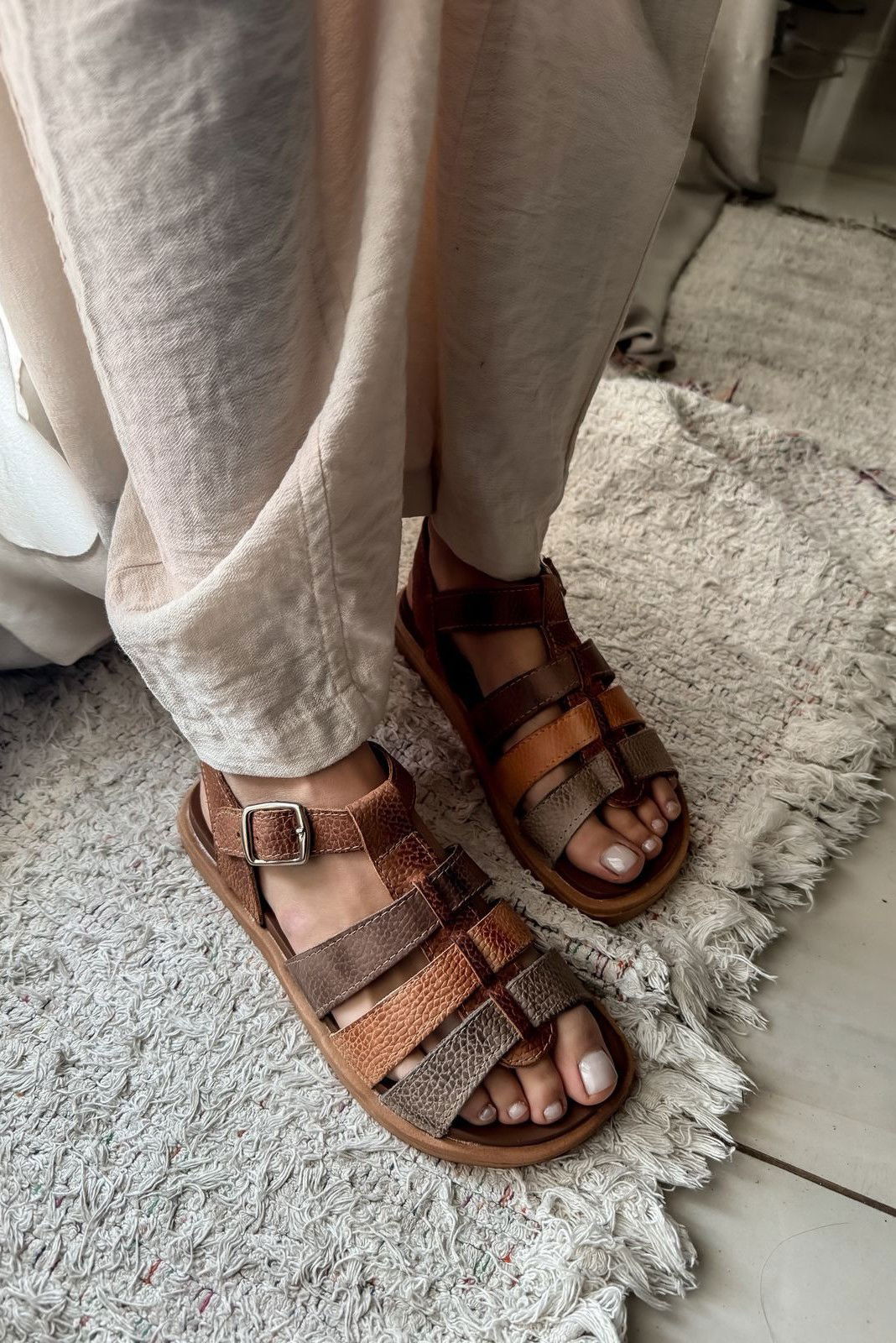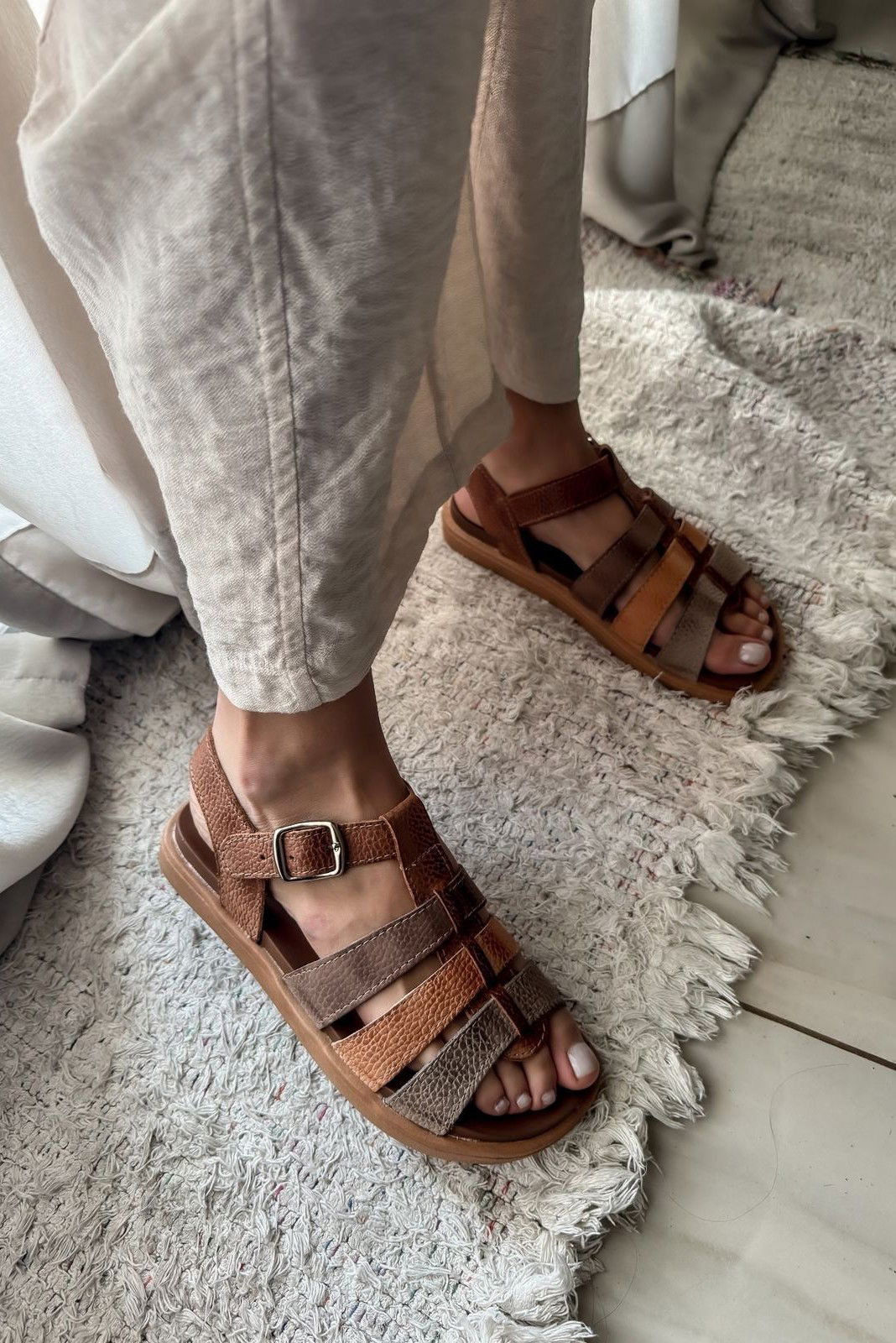 ▪︎ Fabricadas en 100% cuero veteado, su textura natural les da un acabado único y elegante, mientras que las tiras anchas aportan frescura y firmeza en cada paso. ▪︎ El detalle de la hebilla regulable en el talón asegura un calce perfecto y adaptado a tu pie.