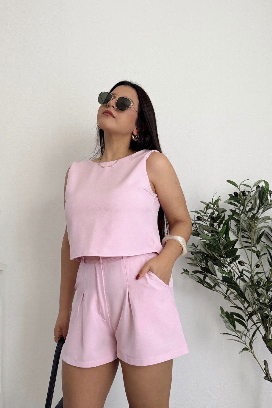 Short con pinzas frontales y cintura cómoda que estiliza la silueta.