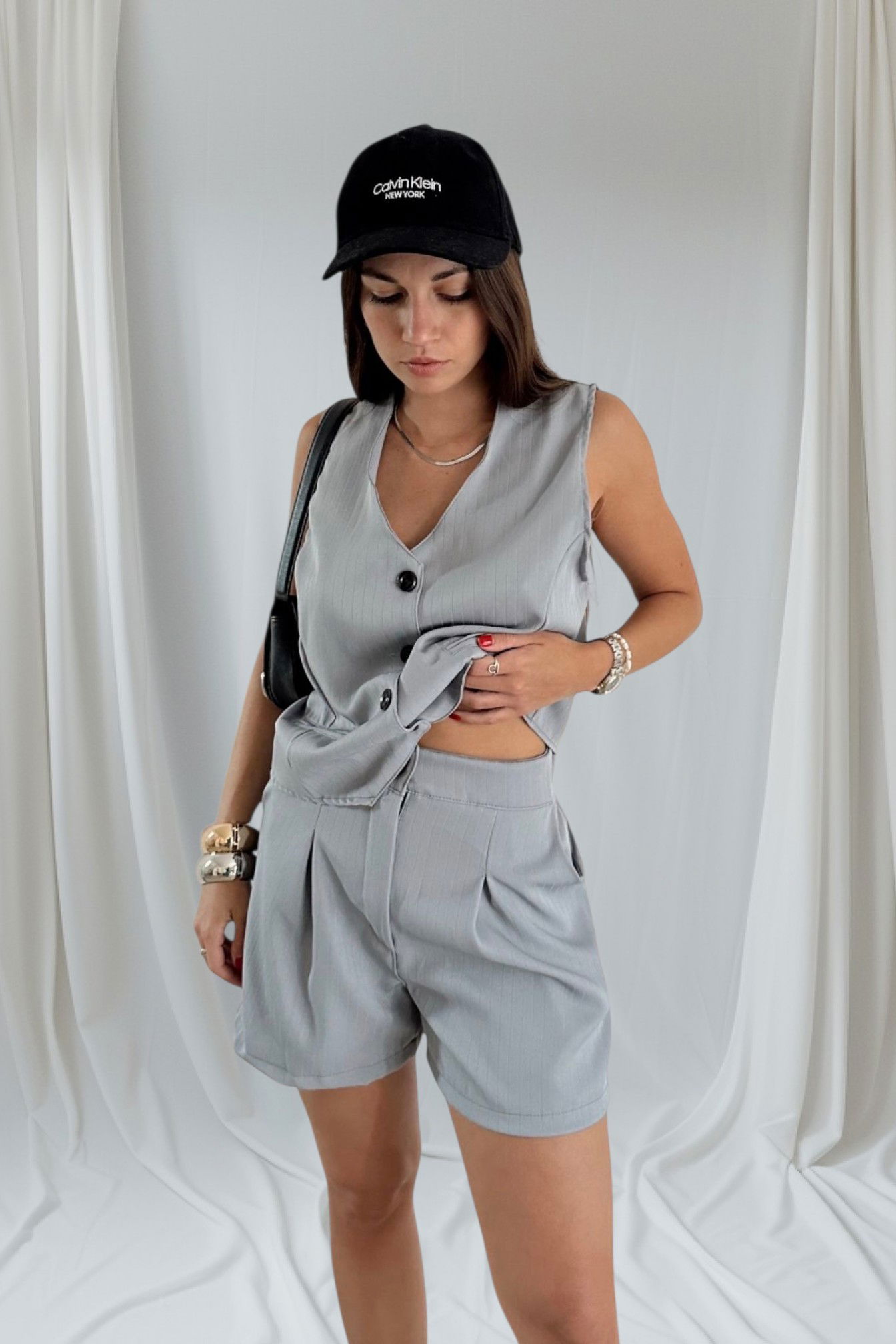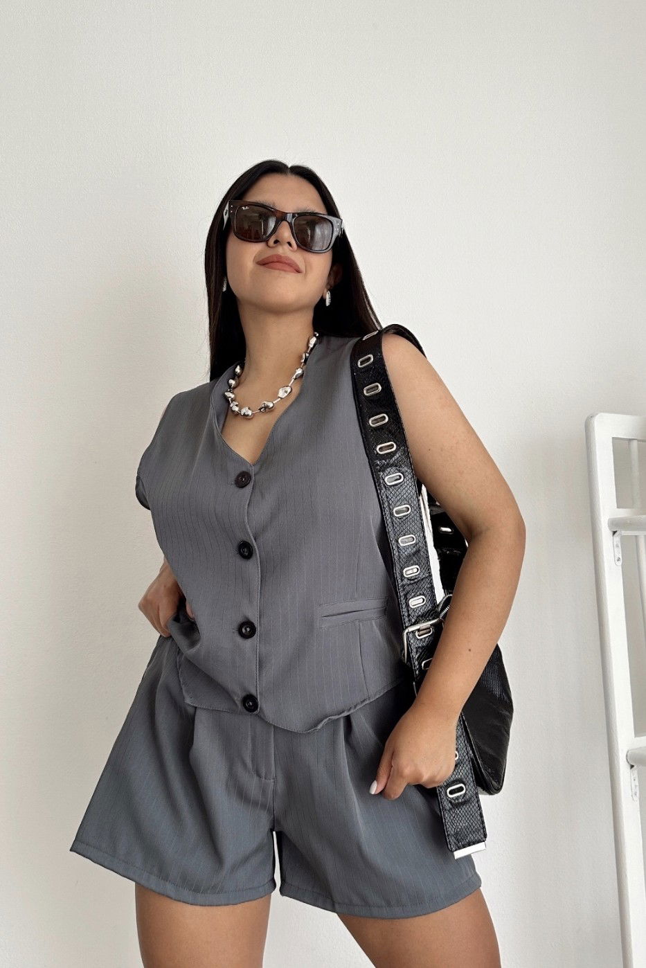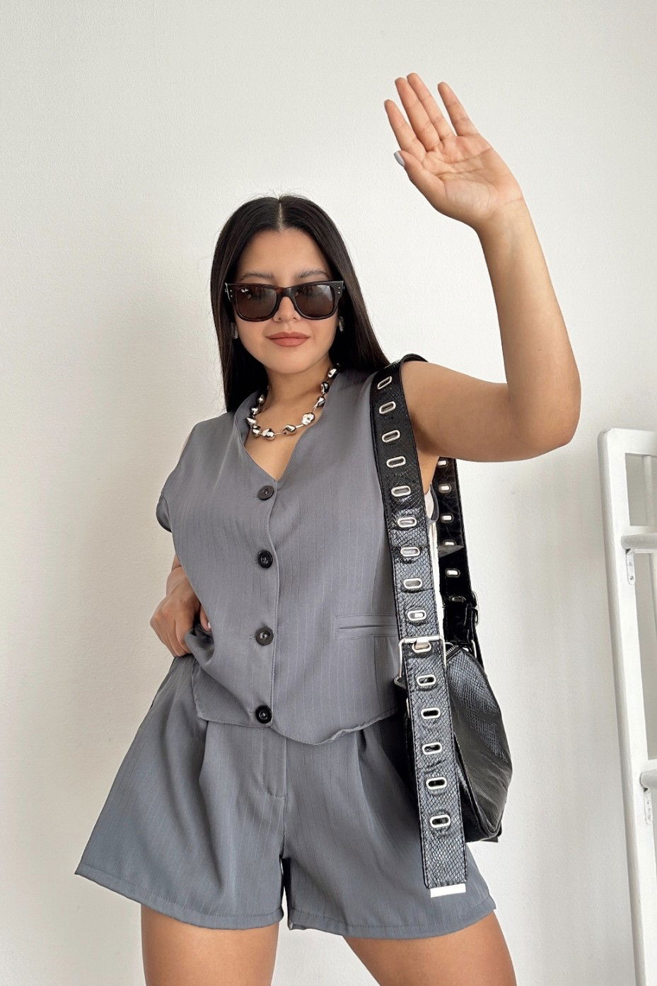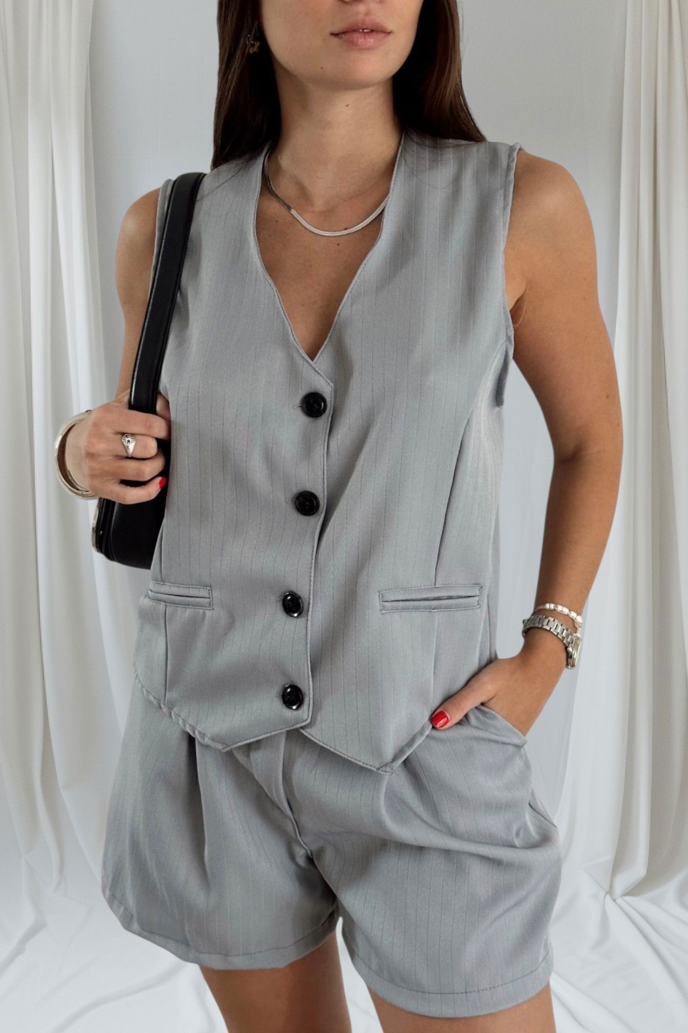 El chaleco cuenta con botones delanteros y escote en “V” que estiliza, mientras que el short presenta un corte amplio con pinzas y bolsillos laterales que aportan comodidad y estilo.