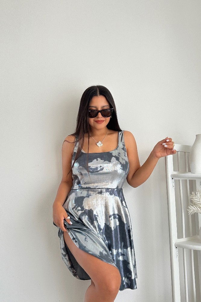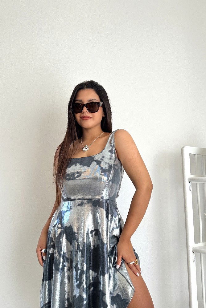 El Vestido Sarai está confeccionado en bizu foil con lubrex, una tela de caída suave y efecto metalizado que refleja la luz con elegancia y modernidad. Su diseño realza la figura con un corte superior ajustado y falda amplia con movimiento fluido, ideal para destacar en cualquier ocasión especial o salida nocturna.