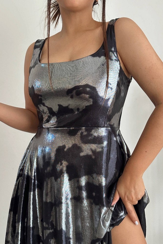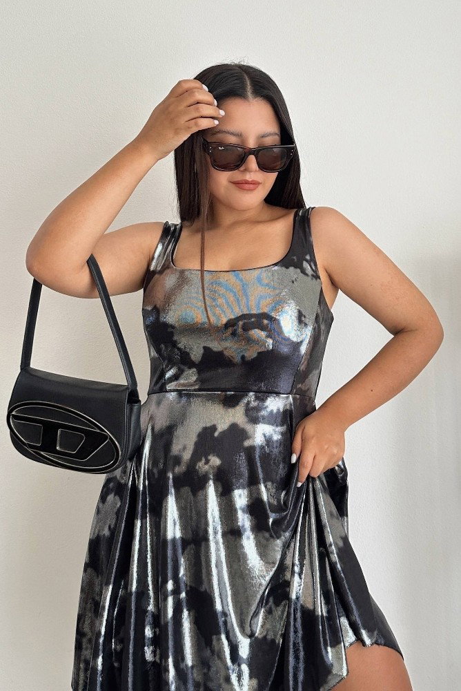 El Vestido Sarai está confeccionado en bizu foil con lubrex, una tela de caída suave y efecto metalizado que refleja la luz con elegancia y modernidad. Su diseño realza la figura con un corte superior ajustado y falda amplia con movimiento fluido, ideal para destacar en cualquier ocasión especial o salida nocturna.