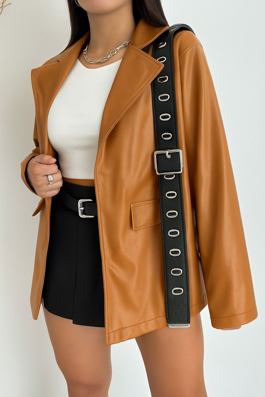 Nuestro blazer de ecocuero combina el diseño sastrero clásico con el toque moderno del acabado leather.
