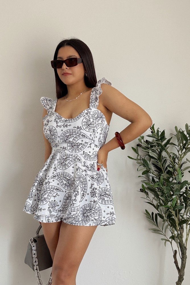 Diseño: mono corto con volados en los hombros y espalda ajustable.