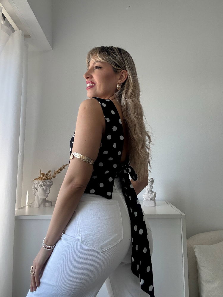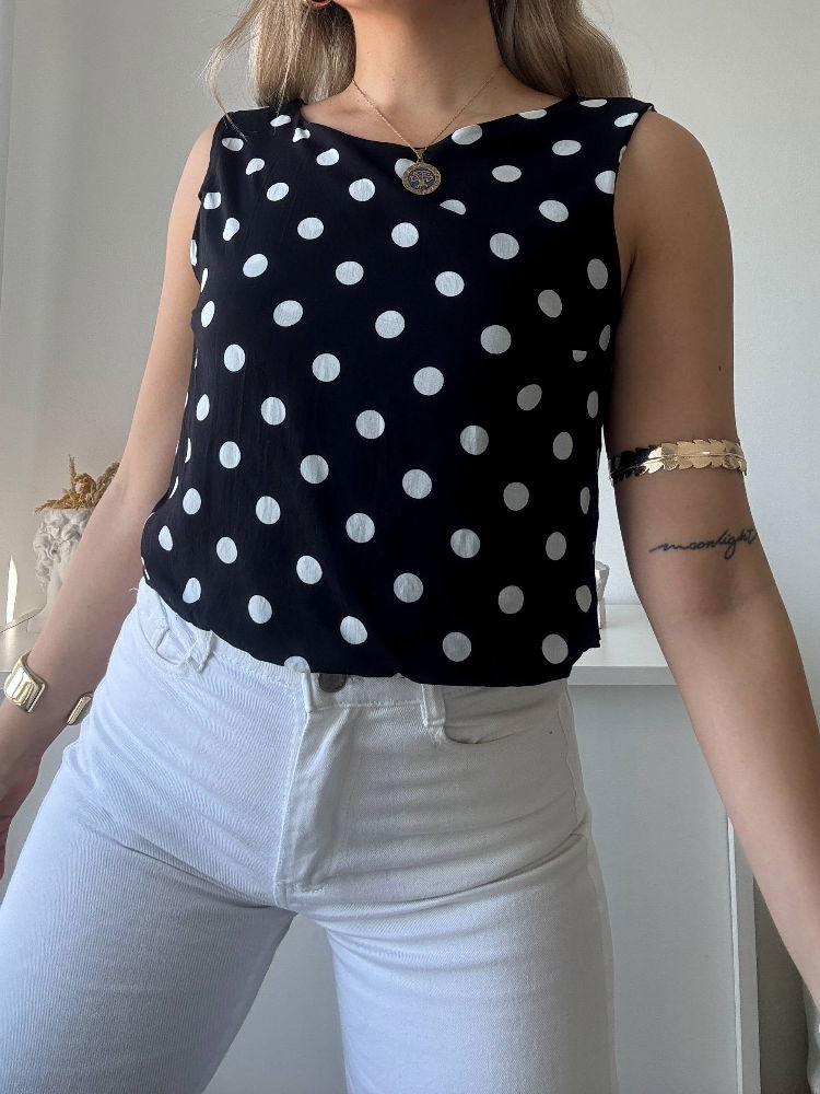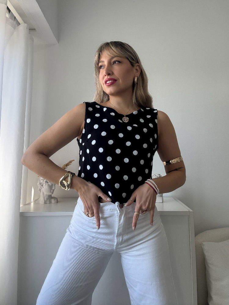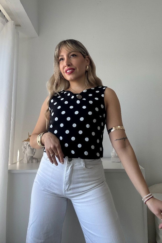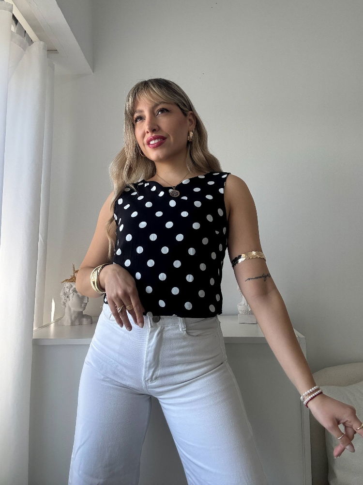 Su diseño sin mangas y el estampado de lunares le dan un toque clásico pero con frescura actual, ideal para combinar con jeans, faldas o pantalones sastreros según tu estilo y ocasión.