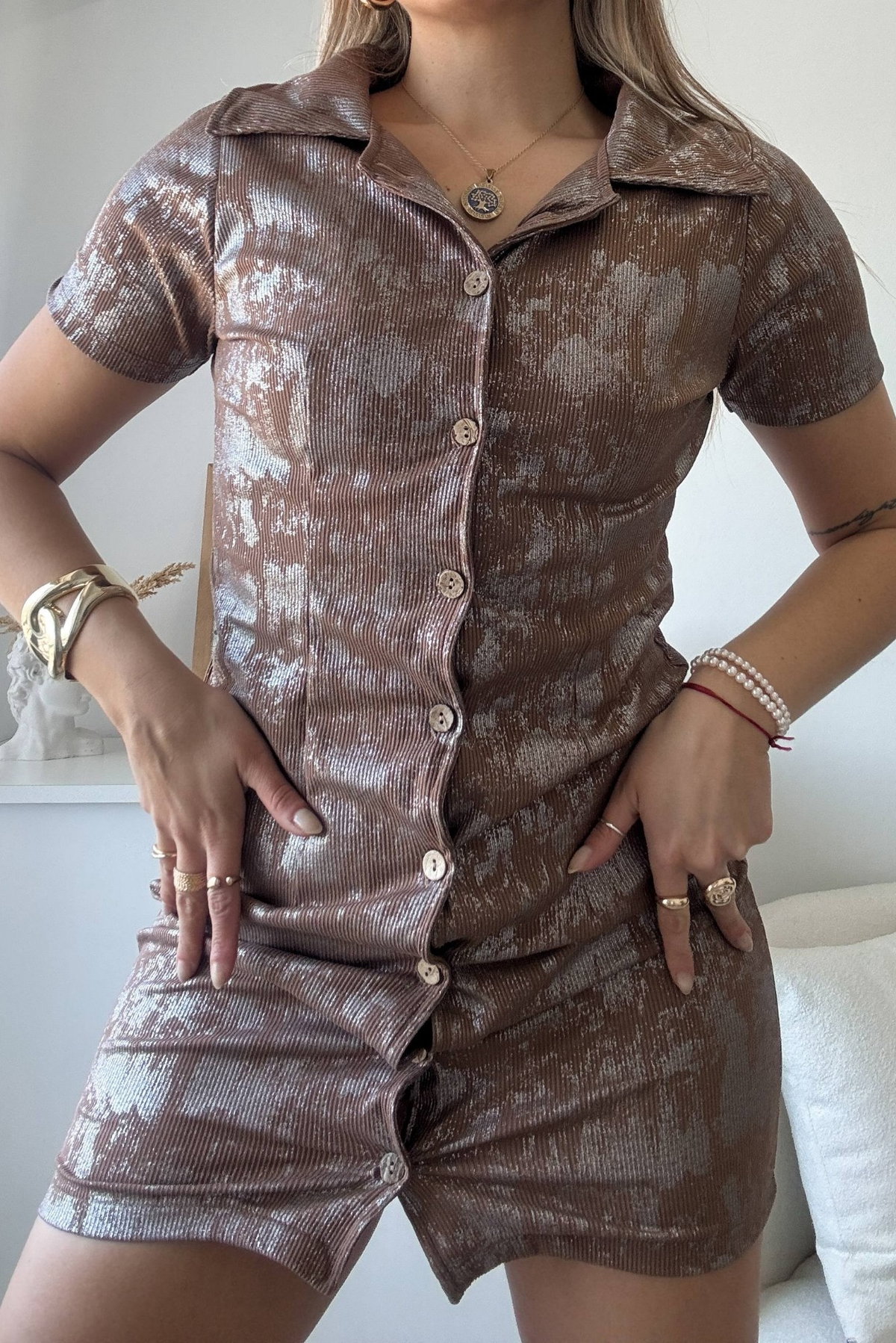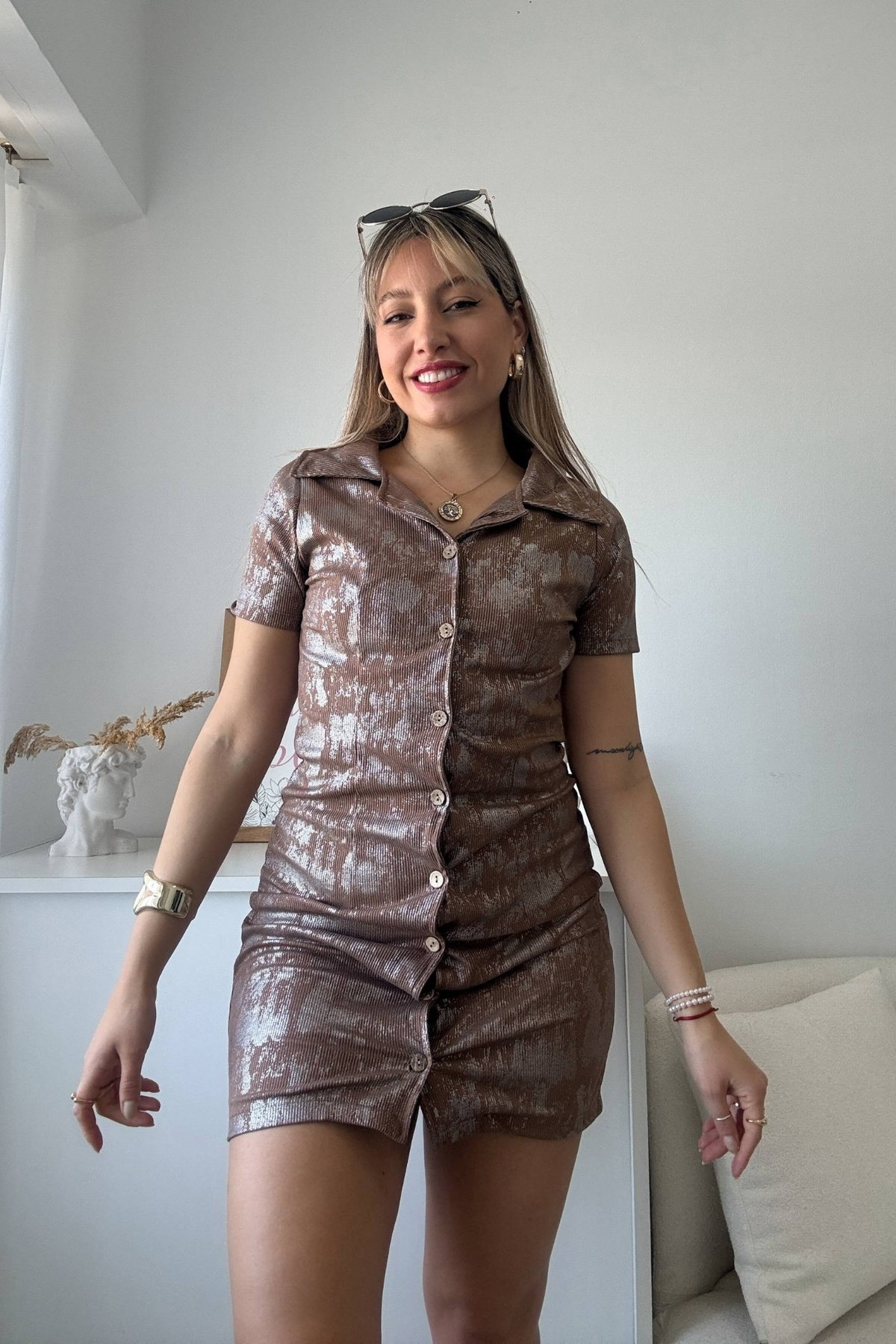 Corte: mini ajustado, cuello camisero y abotonado frontal.