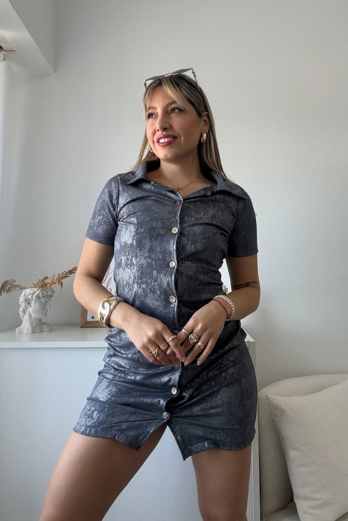 Corte: mini ajustado, cuello camisero y abotonado frontal.