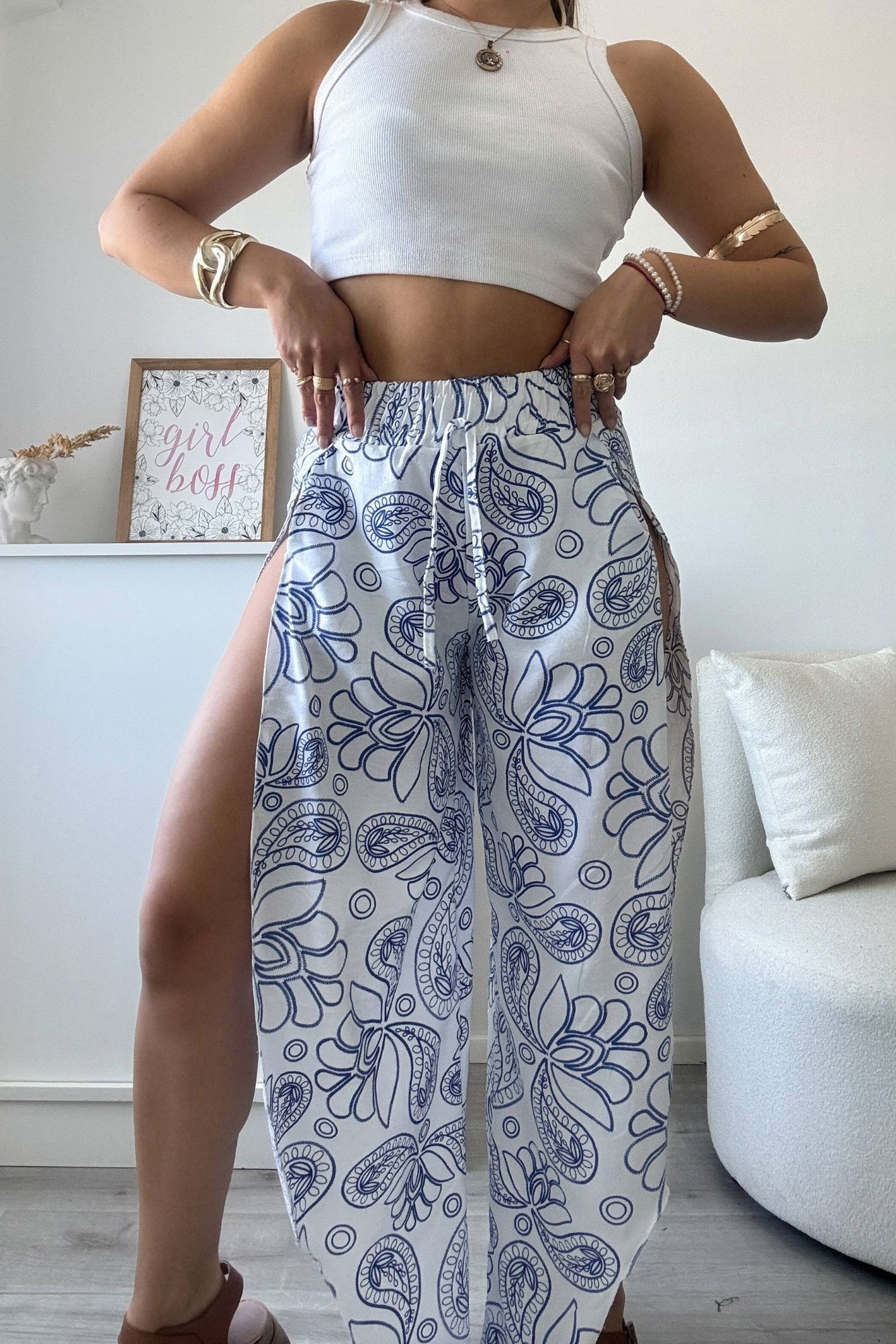 Corte: palazo con tajos laterales amplios y cintura elástica con cordón.