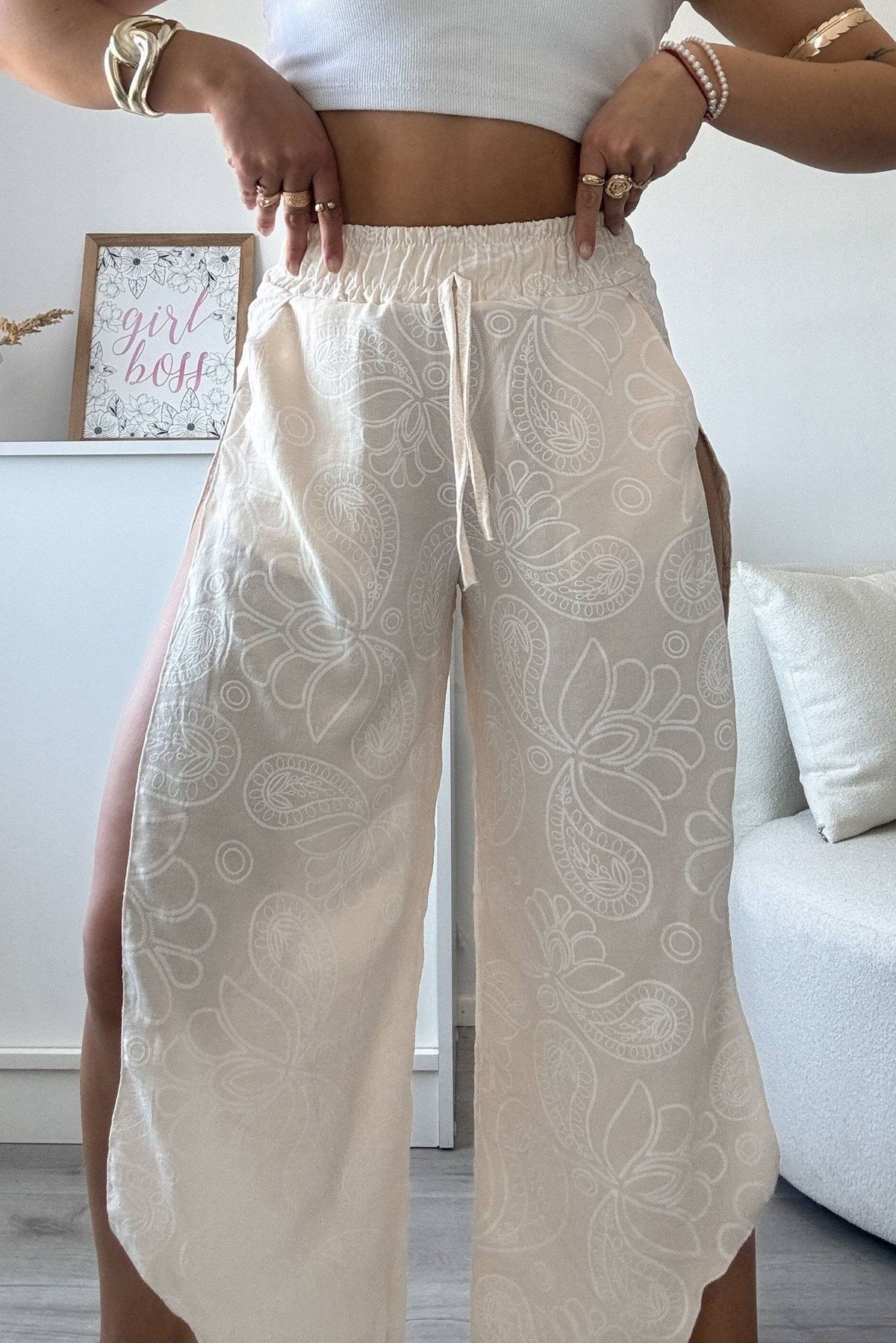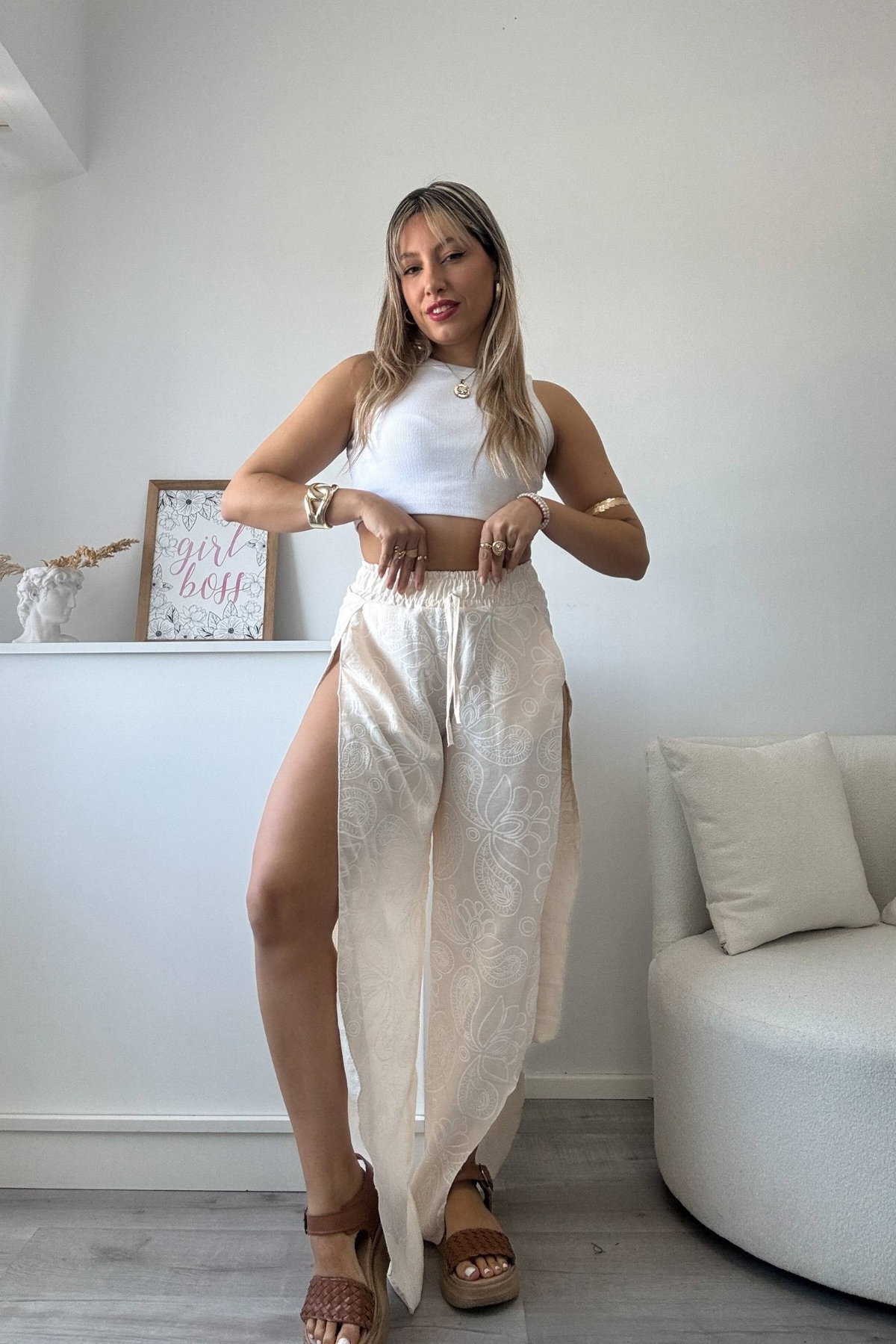 Corte: palazo con tajos laterales amplios y cintura elástica con cordón.