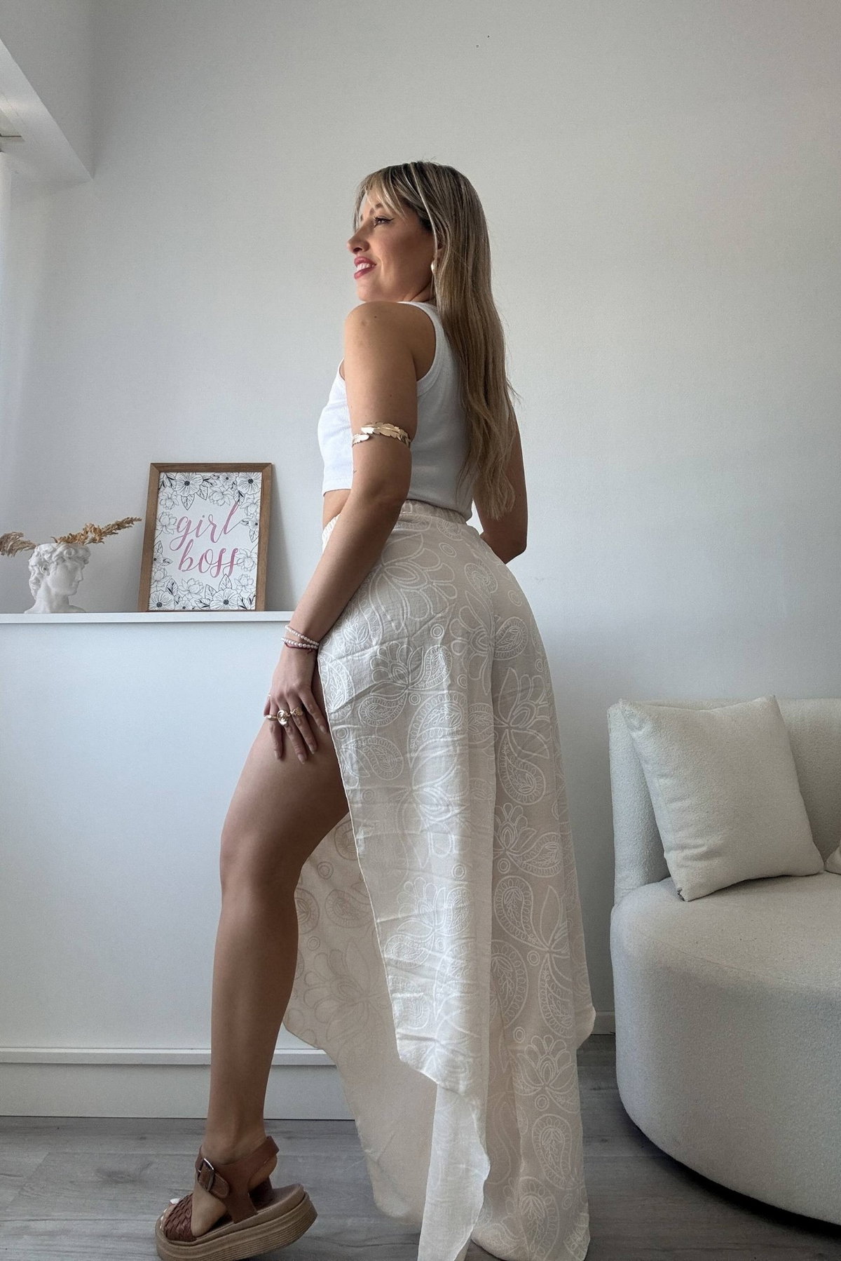 Su corte amplio con tajos laterales crea un movimiento natural al caminar, mientras que la cintura elástica con cordón ajustable asegura un calce perfecto para todo tipo de cuerpo.