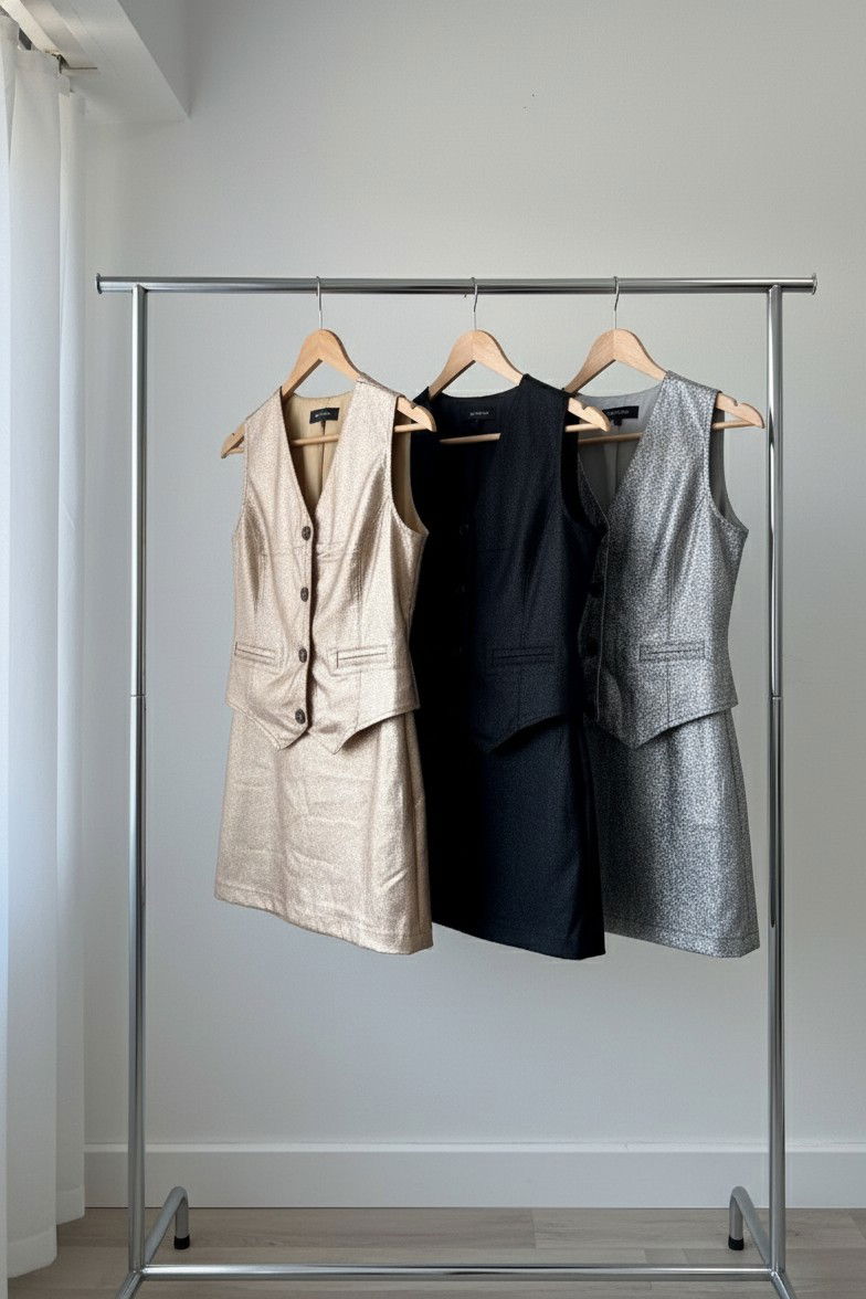 Compuesto por chaleco sastrero con botones delanteros funcionales y pollera al tono, este conjunto equilibra la elegancia clásica con un aire moderno y audaz.