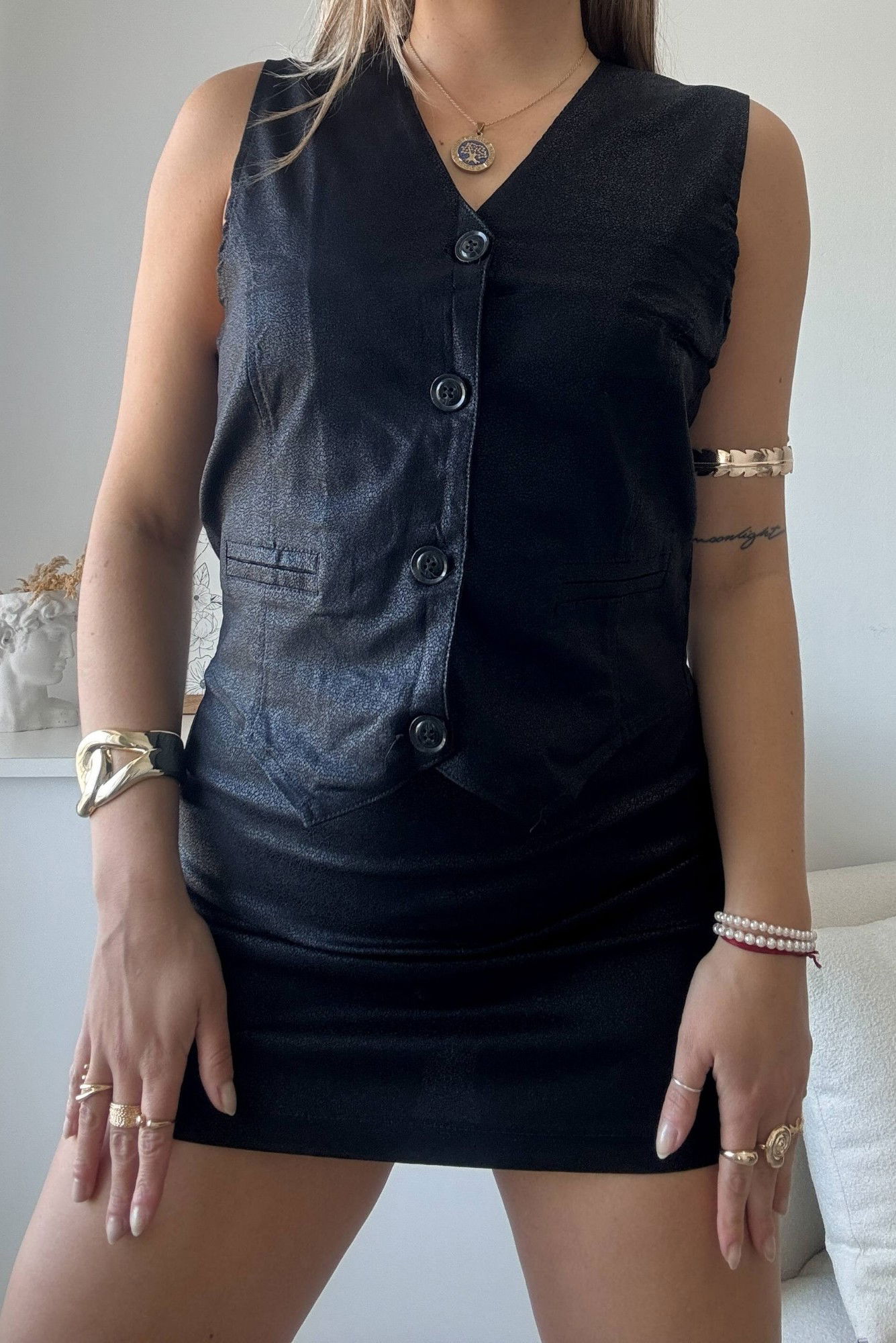 Corte: Chaleco con escote en “V”, pinzas de entalle y bolsillos decorativos + Mini falda recta tiro medio.
