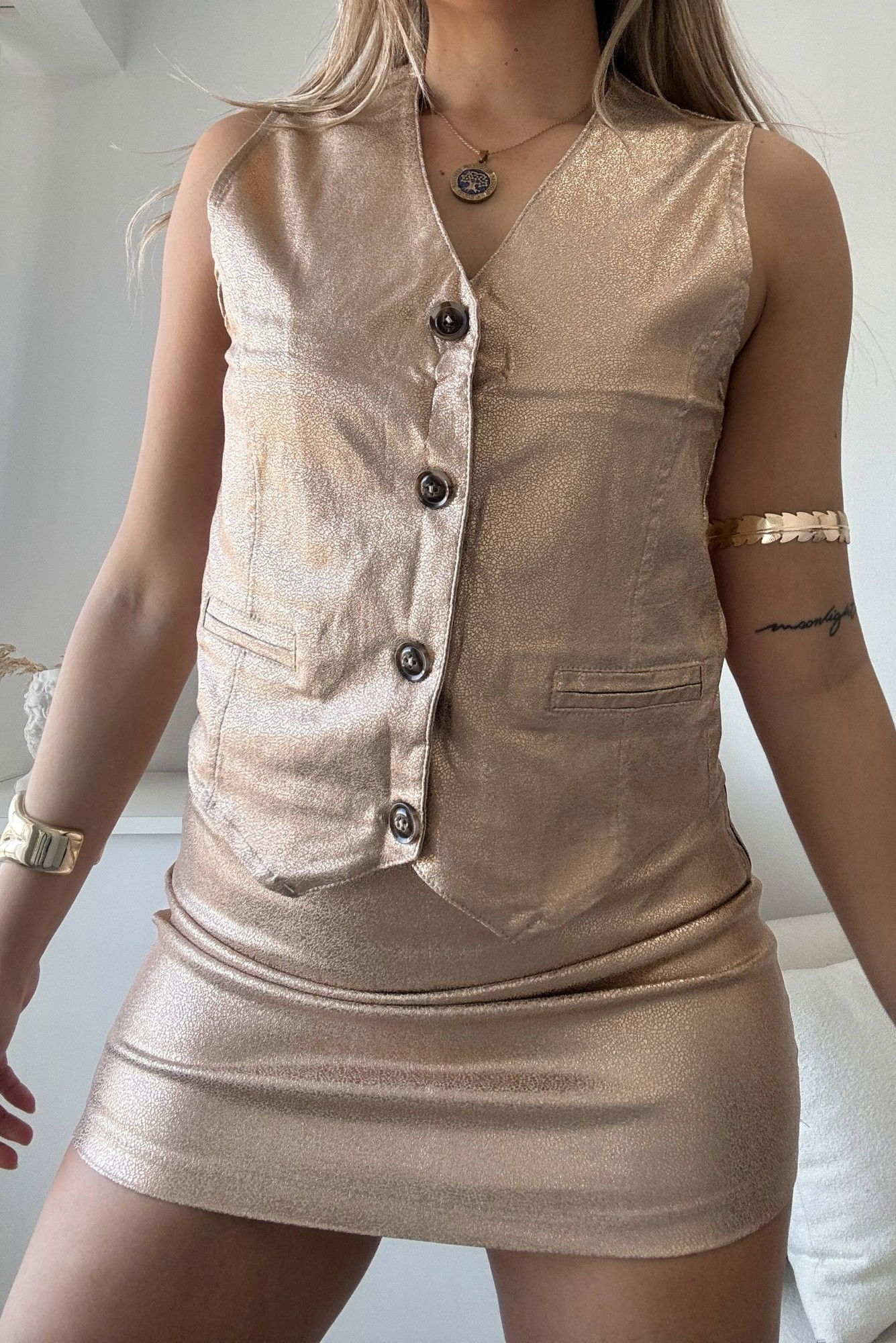 Corte: Chaleco con escote en “V”, pinzas de entalle y bolsillos decorativos + Mini falda recta tiro medio.