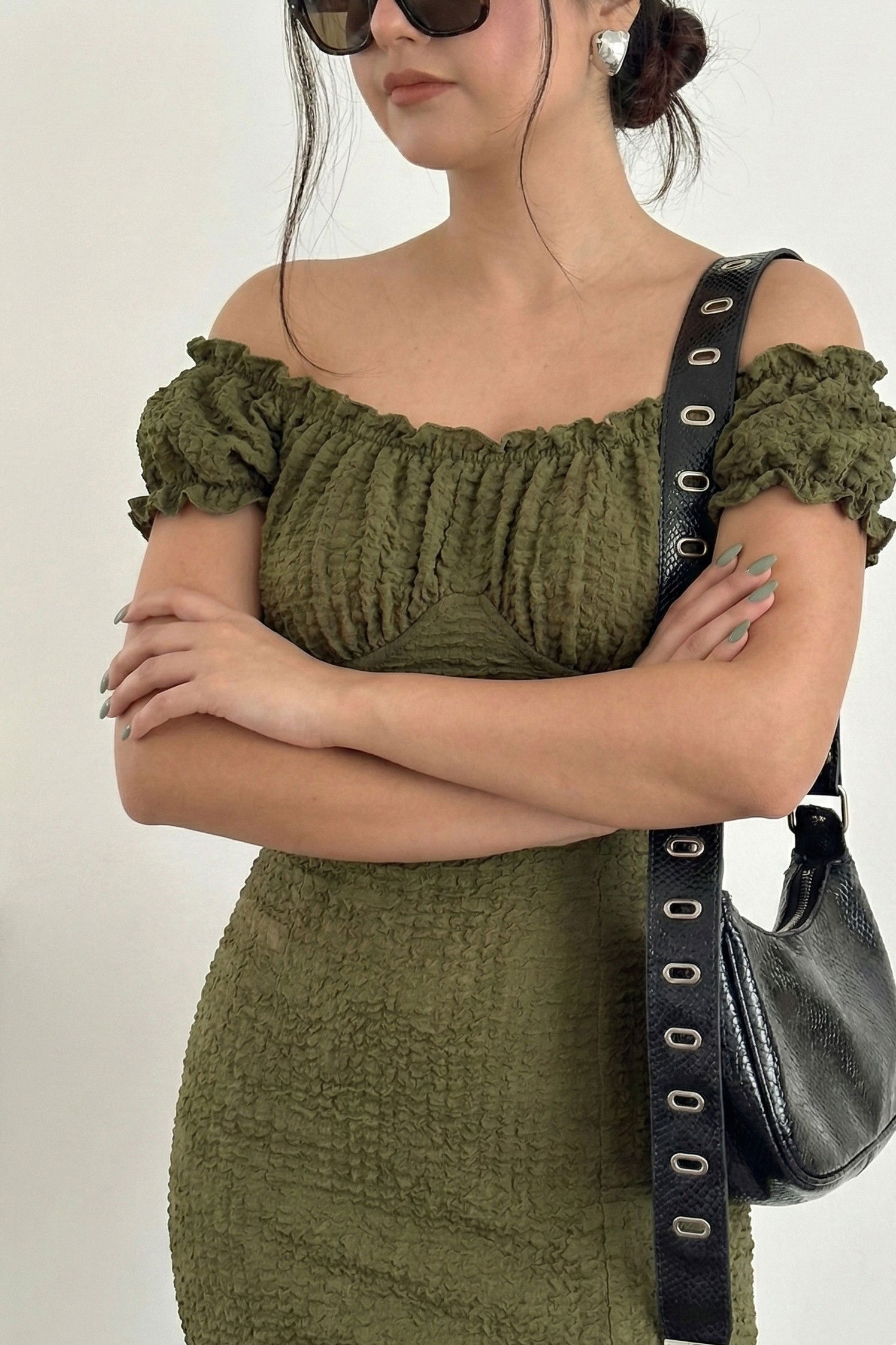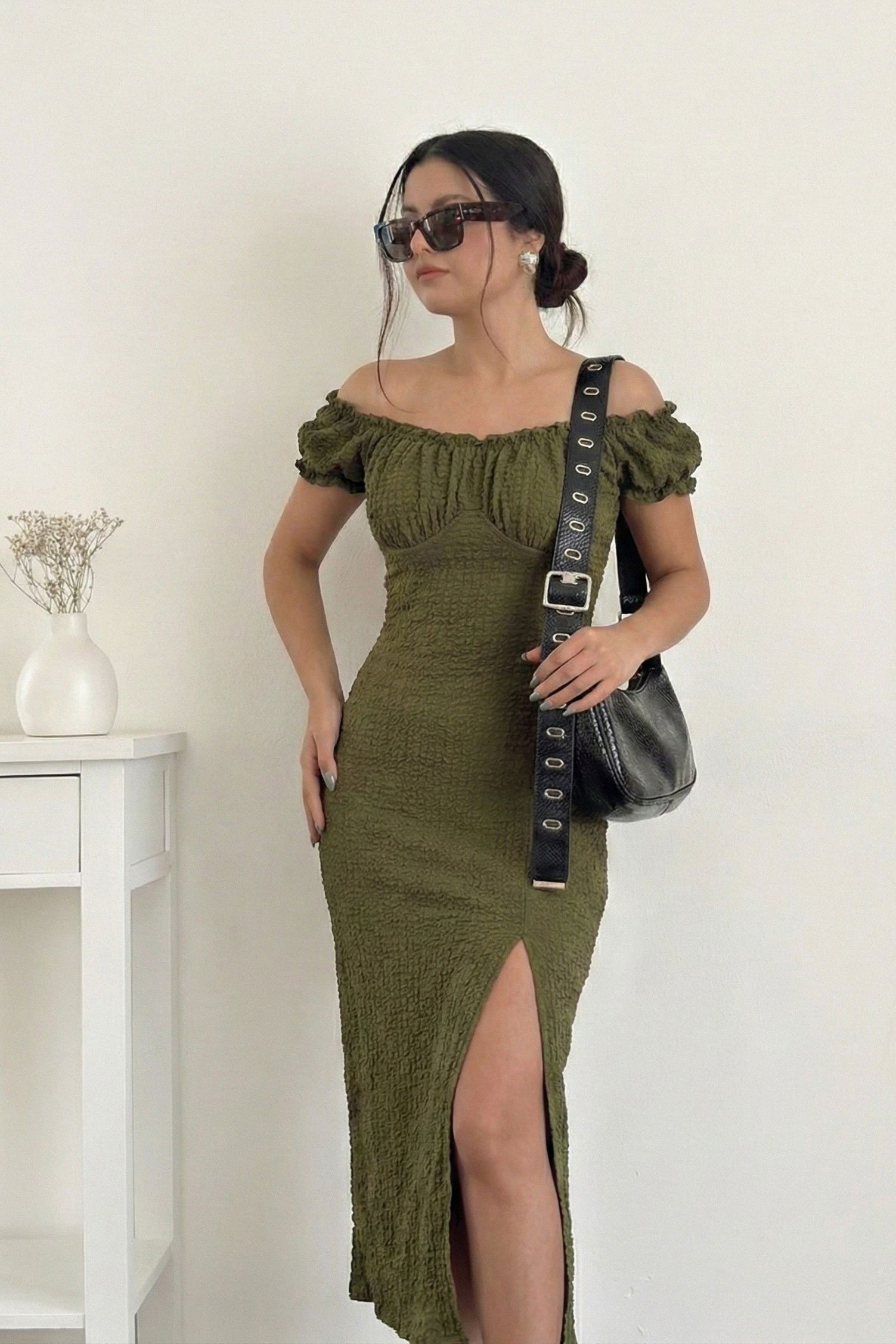Su diseño con hombros descubiertos, frunces que estilizan el busto y tajito lateral lo convierten en un vestido súper femenino y favorecedor. Se adapta al cuerpo sin marcar de más y resalta la silueta.