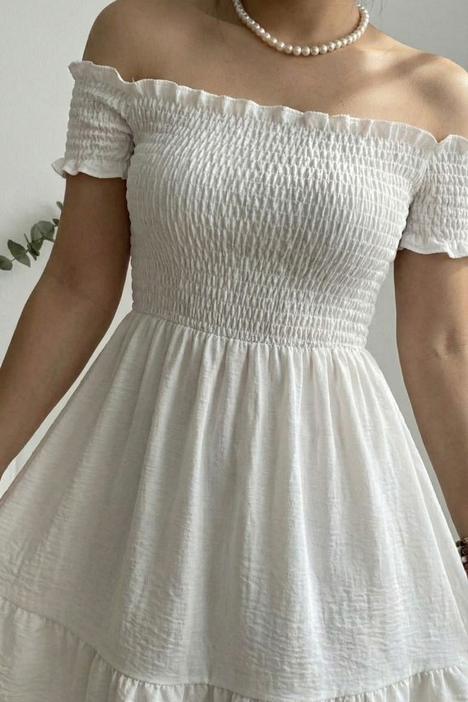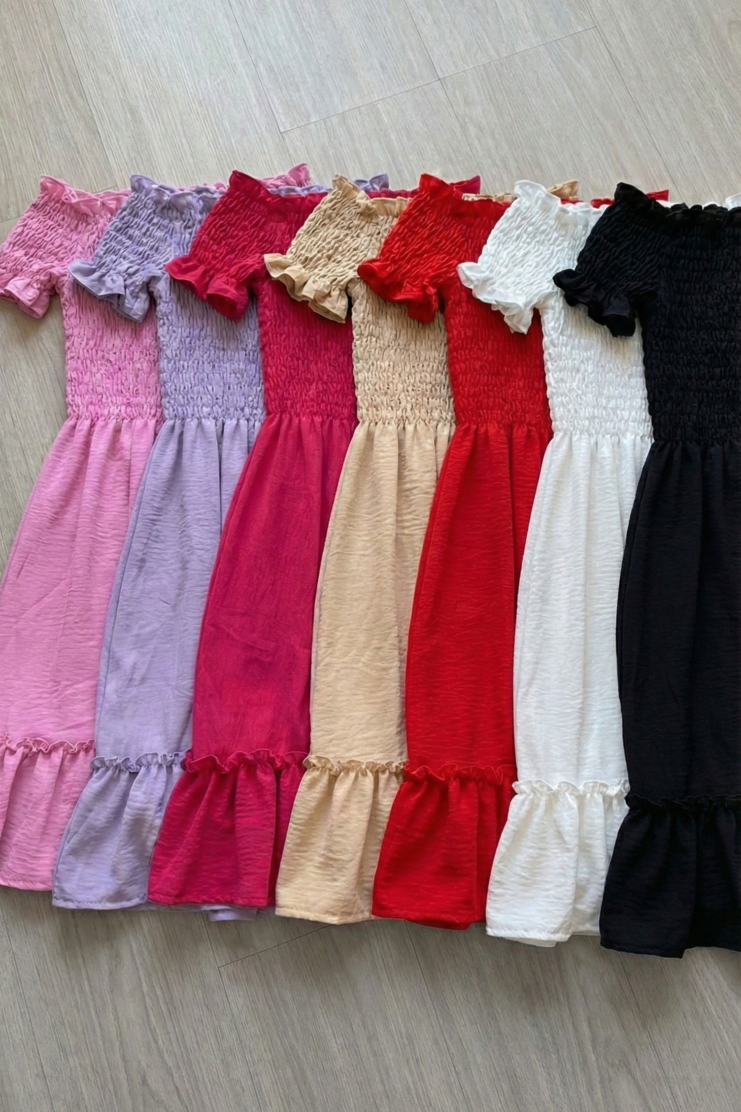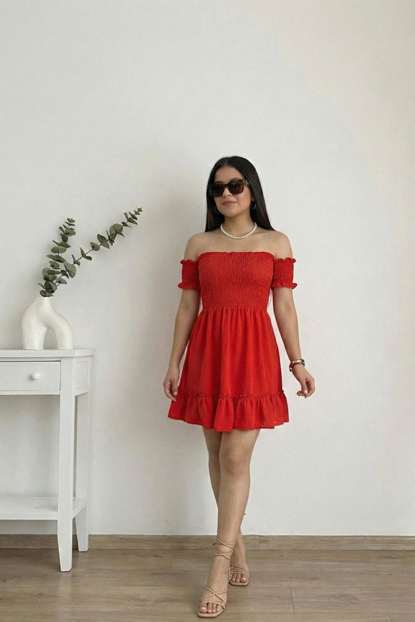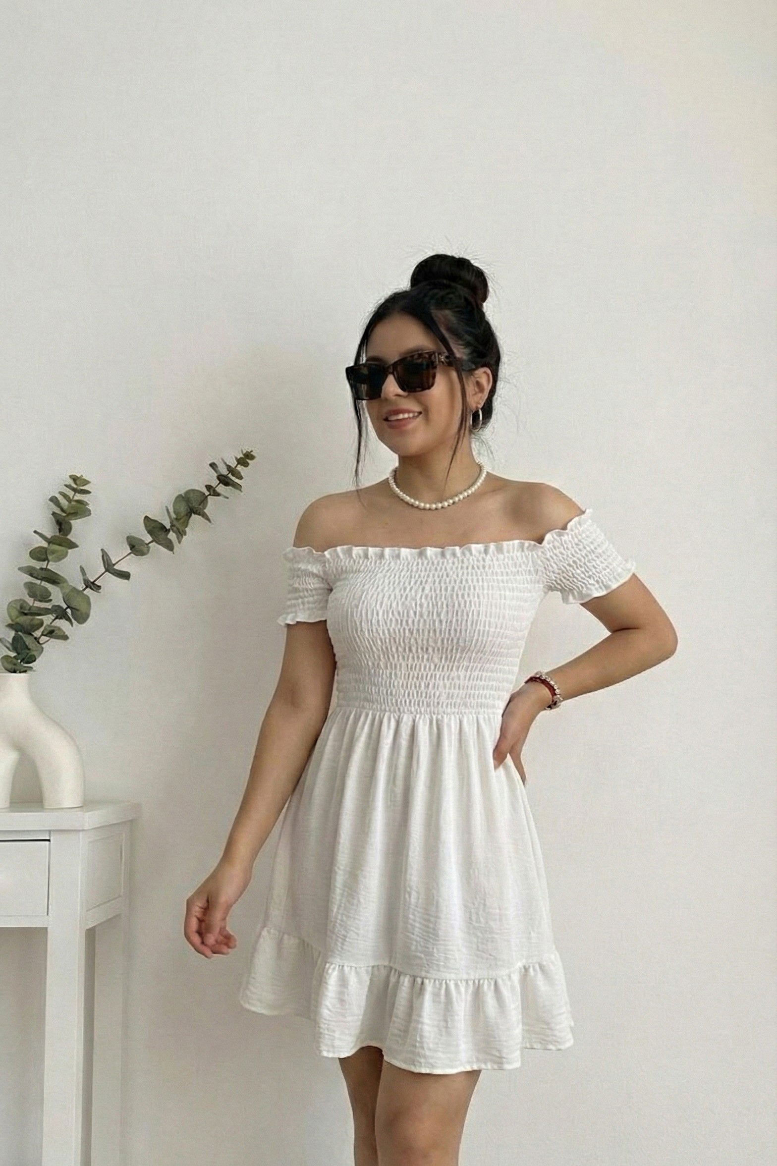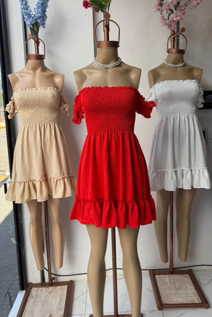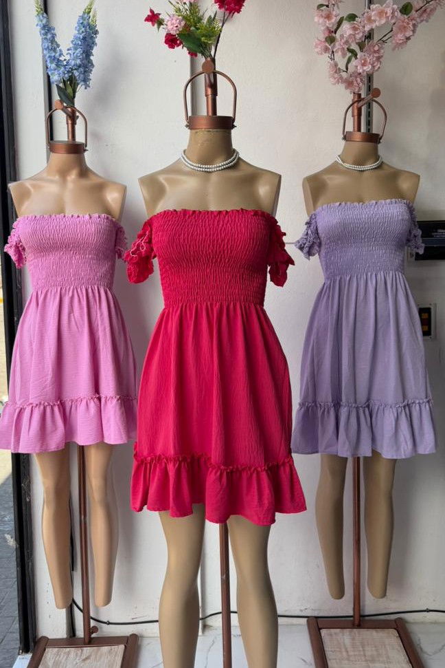 Confeccionado en tela Cey con glitter ✨ súper liviana, fresca y con un brillo sutil que lo hace ideal para cualquier salida. Su diseño off shoulder con frunces en el busto garantiza un calce perfecto, cómodo y adaptable al cuerpo.