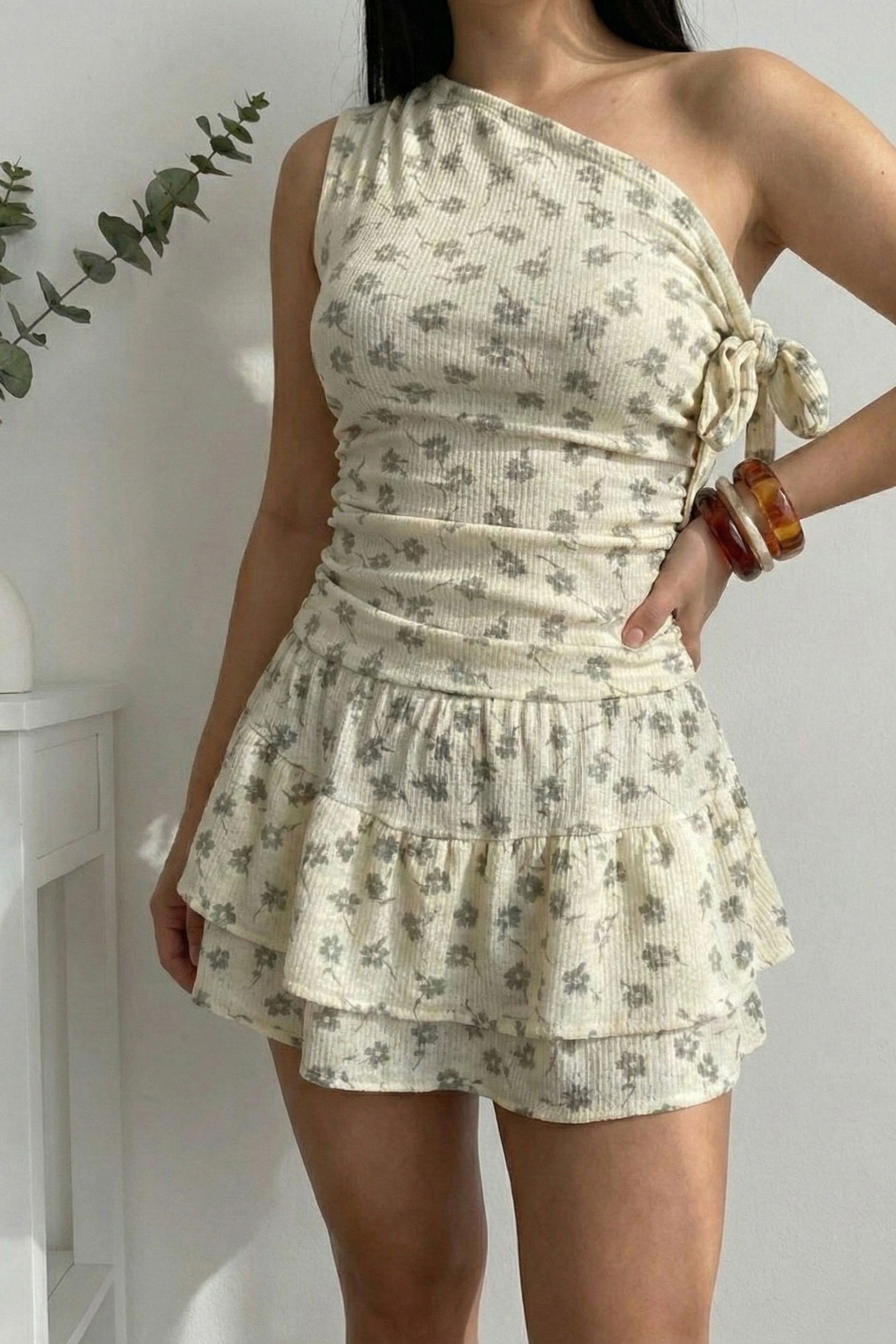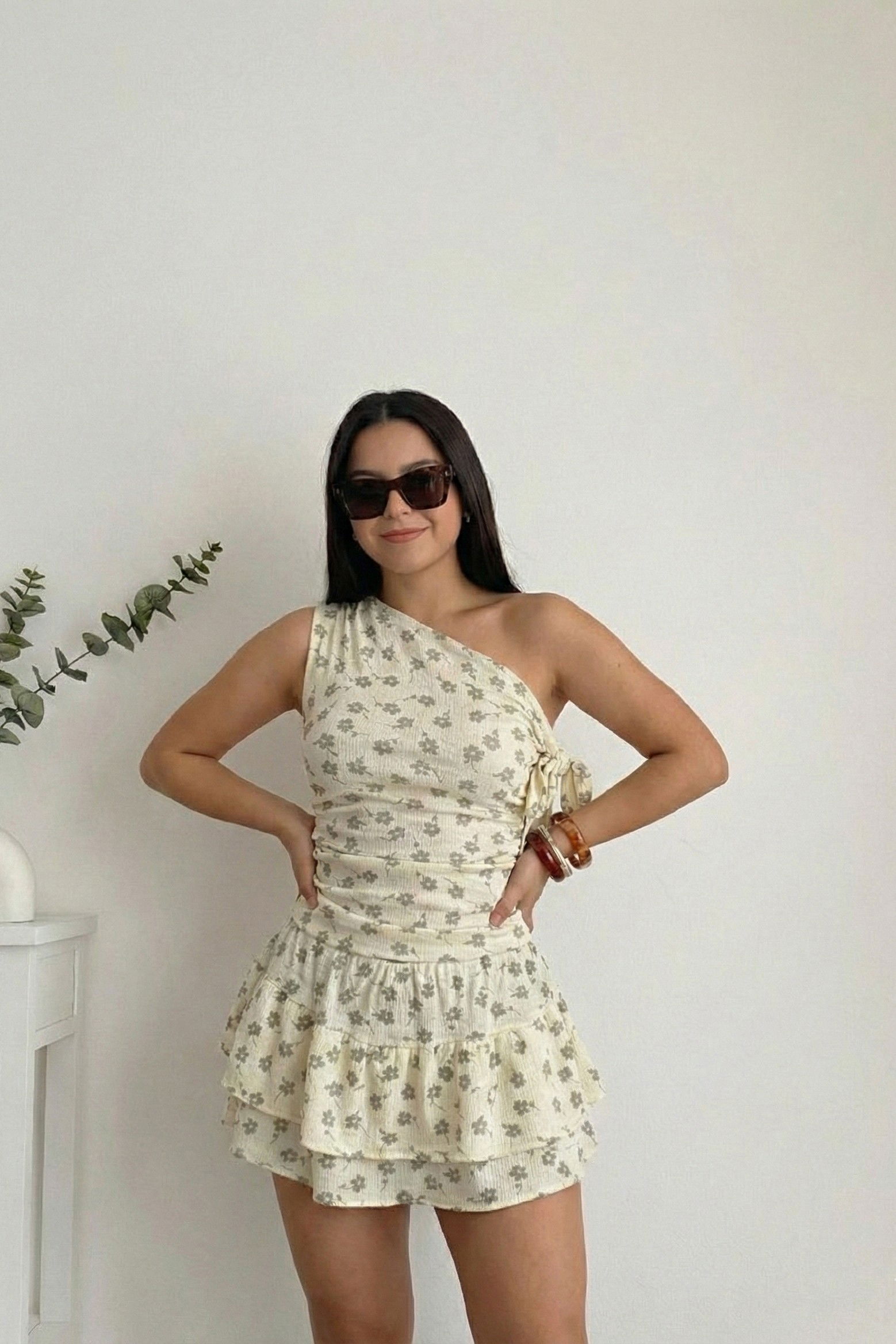 Confeccionado en tela Bruselas estampada, suave, liviana y con caída perfecta. La parte superior es asimétrica con un lazo lateral que le da un toque súper femenino y original.