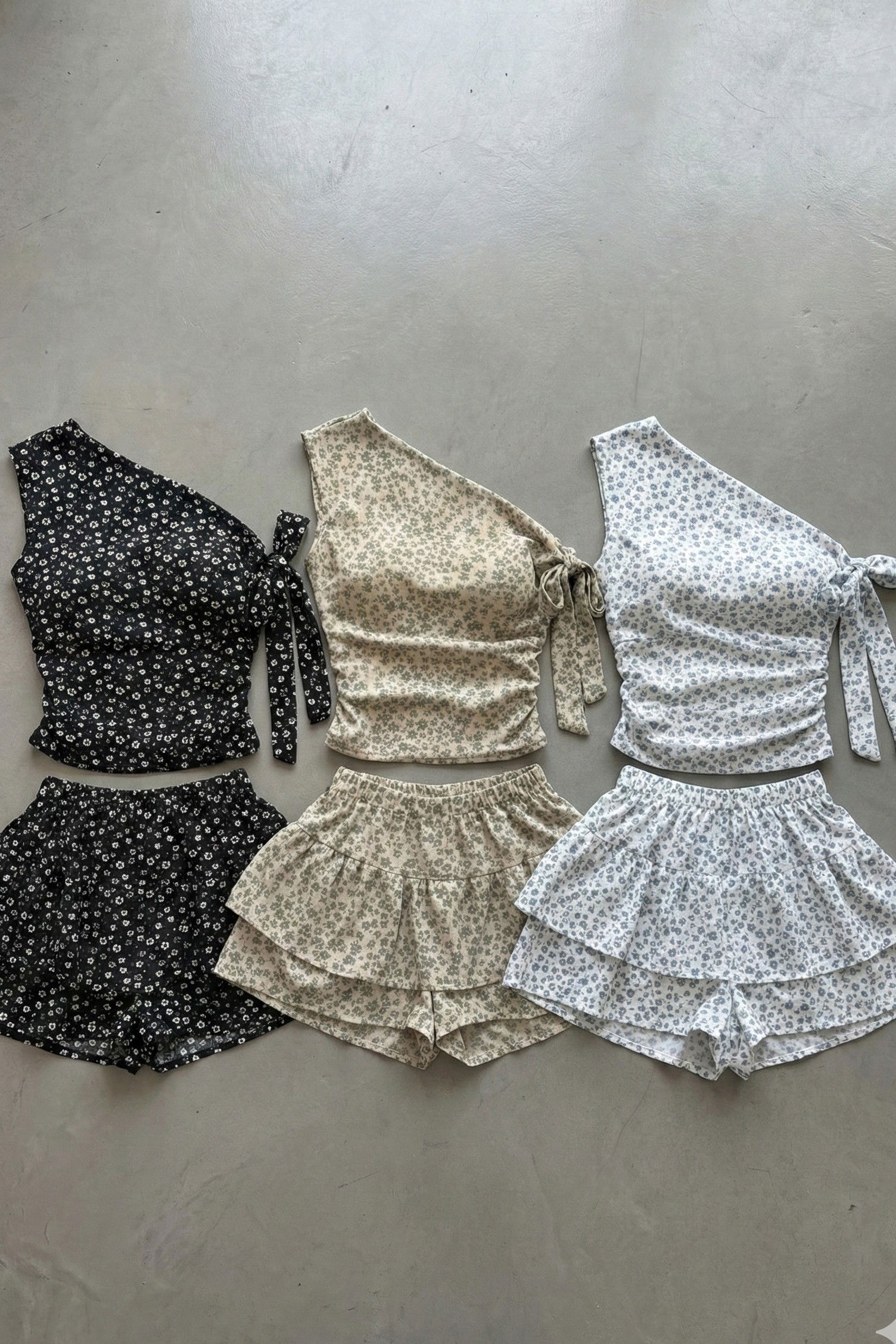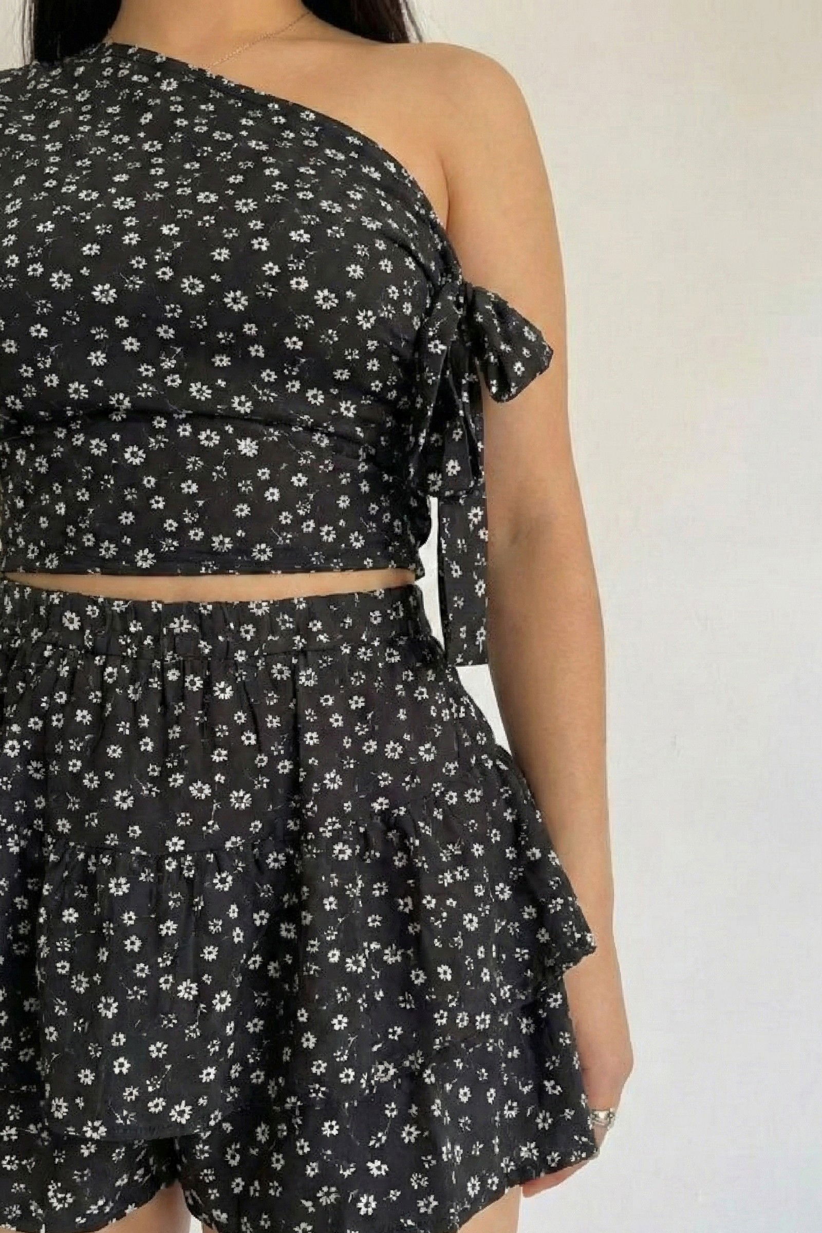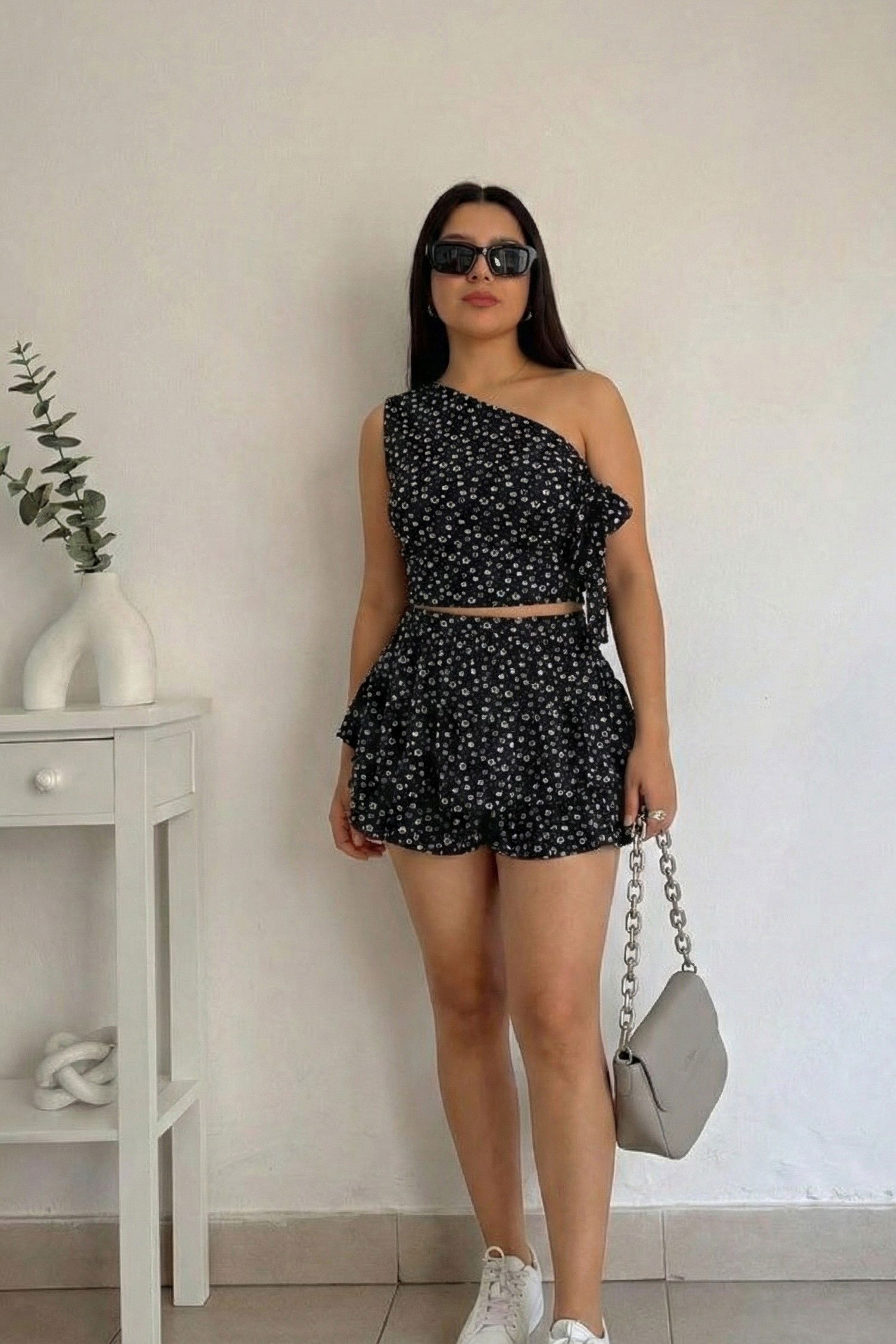 Confeccionado en tela Bruselas estampada, suave, liviana y con caída perfecta. La parte superior es asimétrica con un lazo lateral que le da un toque súper femenino y original.