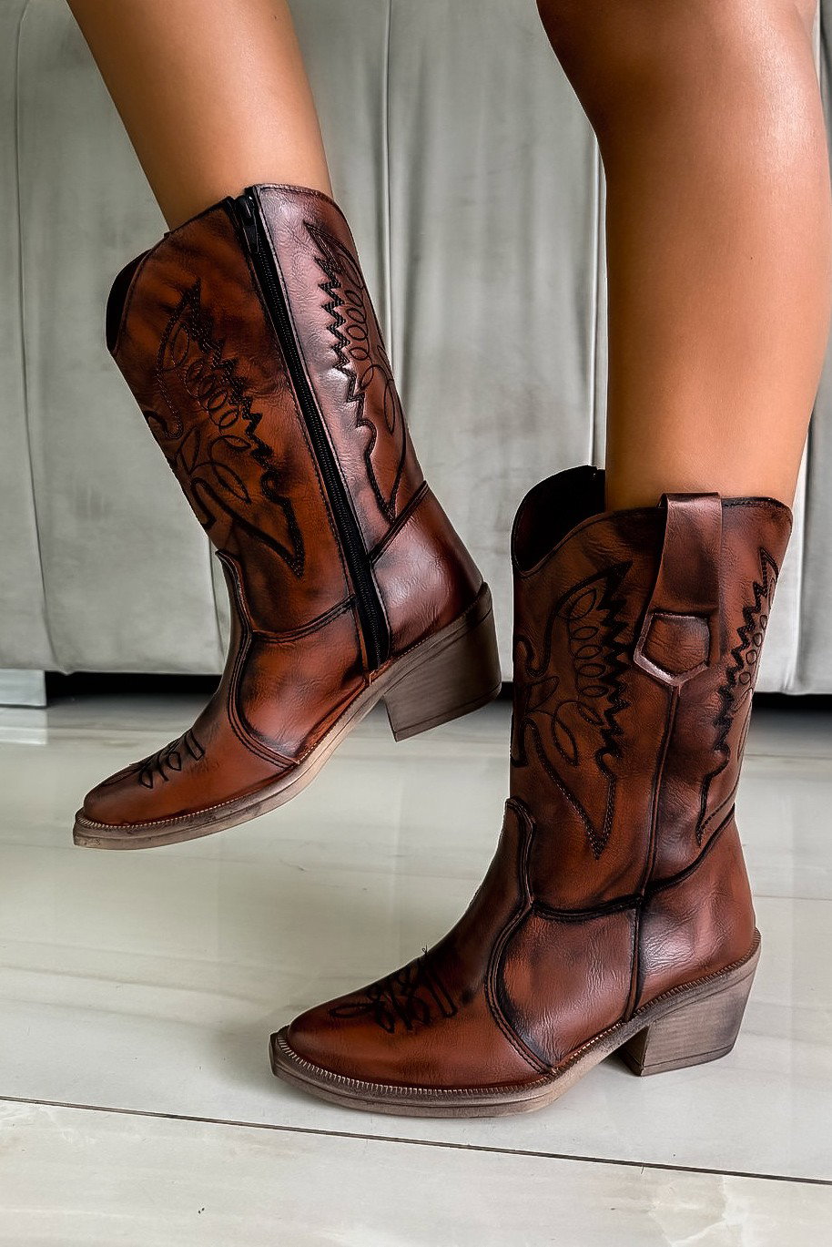 Texana media confeccionada en cuero sintético, con diseño clásico western y costuras decorativas marcadas en la caña y el empeine.