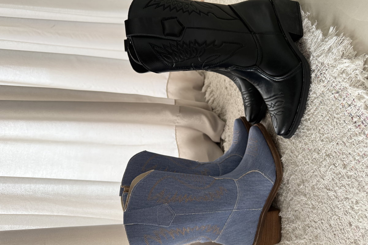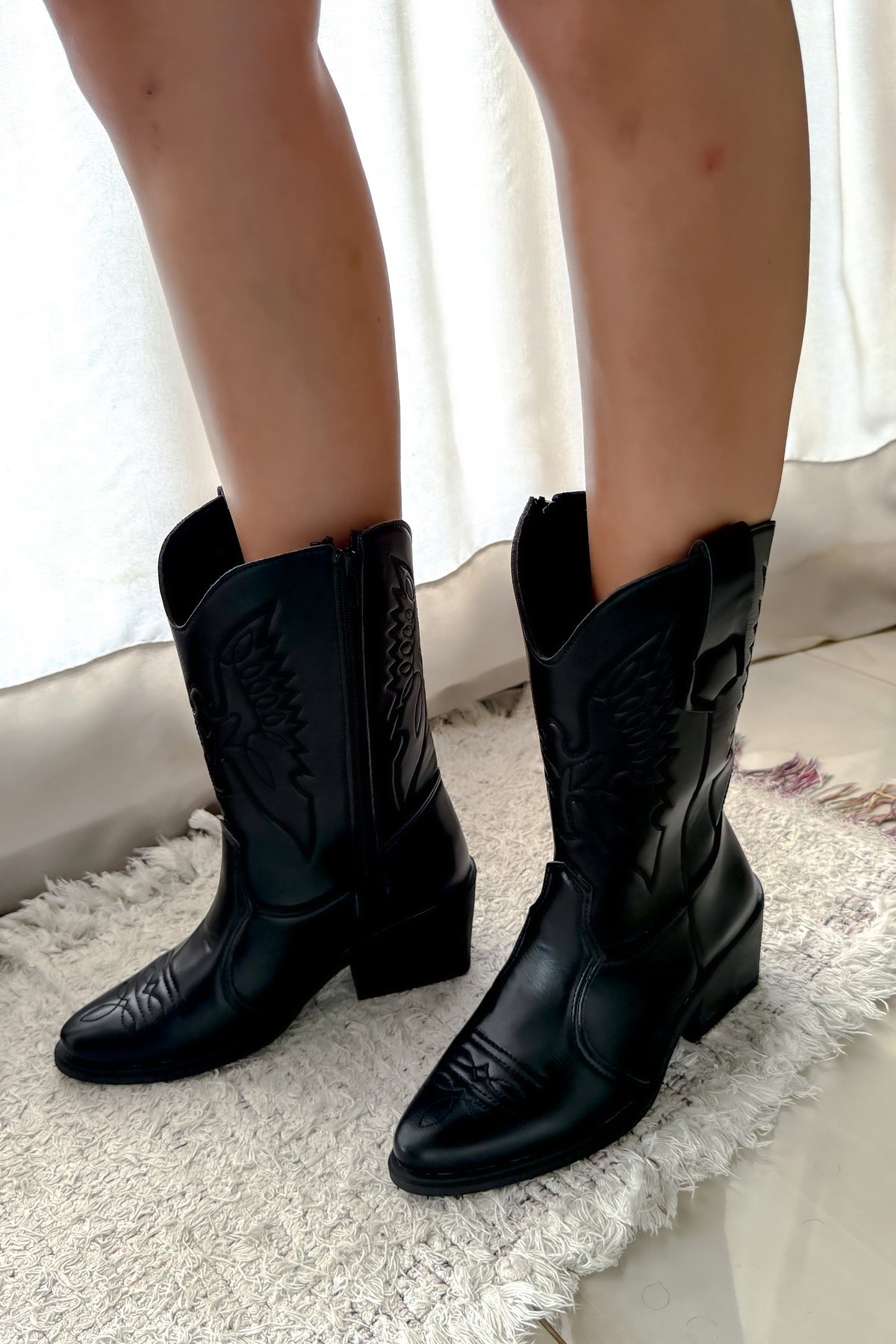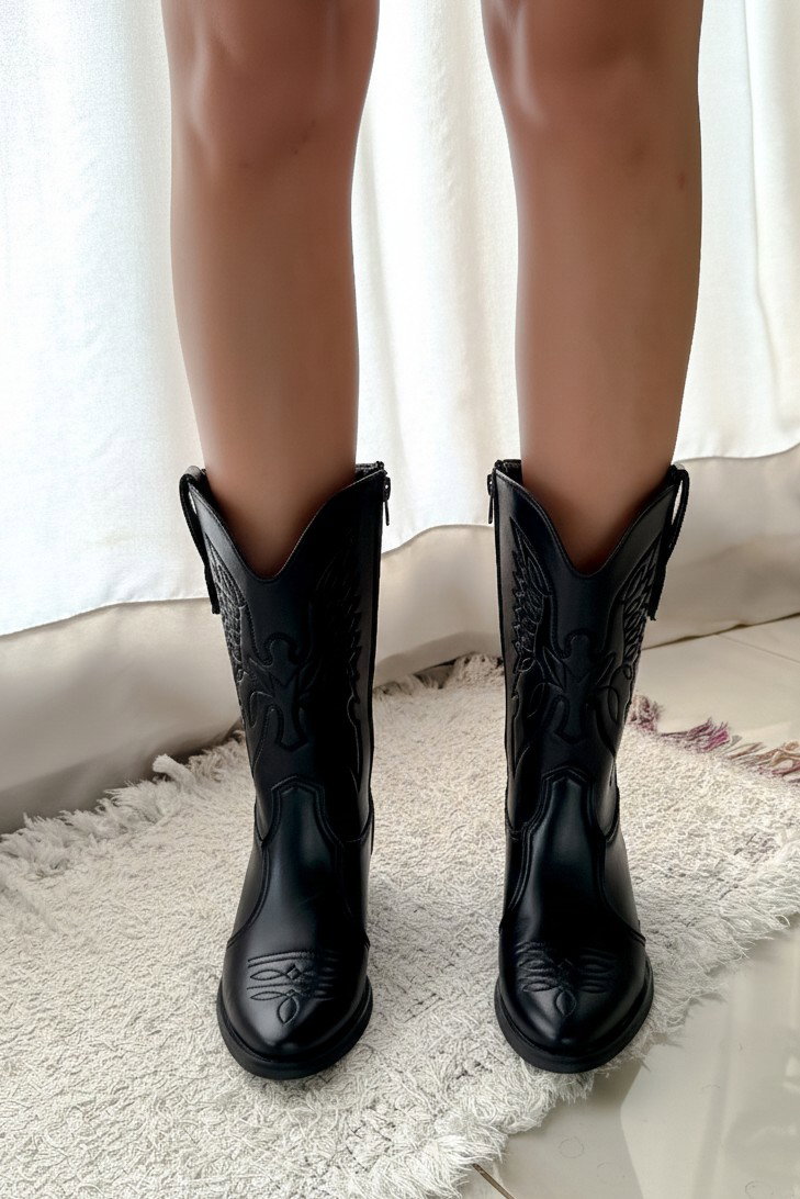 En la versión negra, el acabado es liso con costuras en relieve que resaltan el estilo texano.