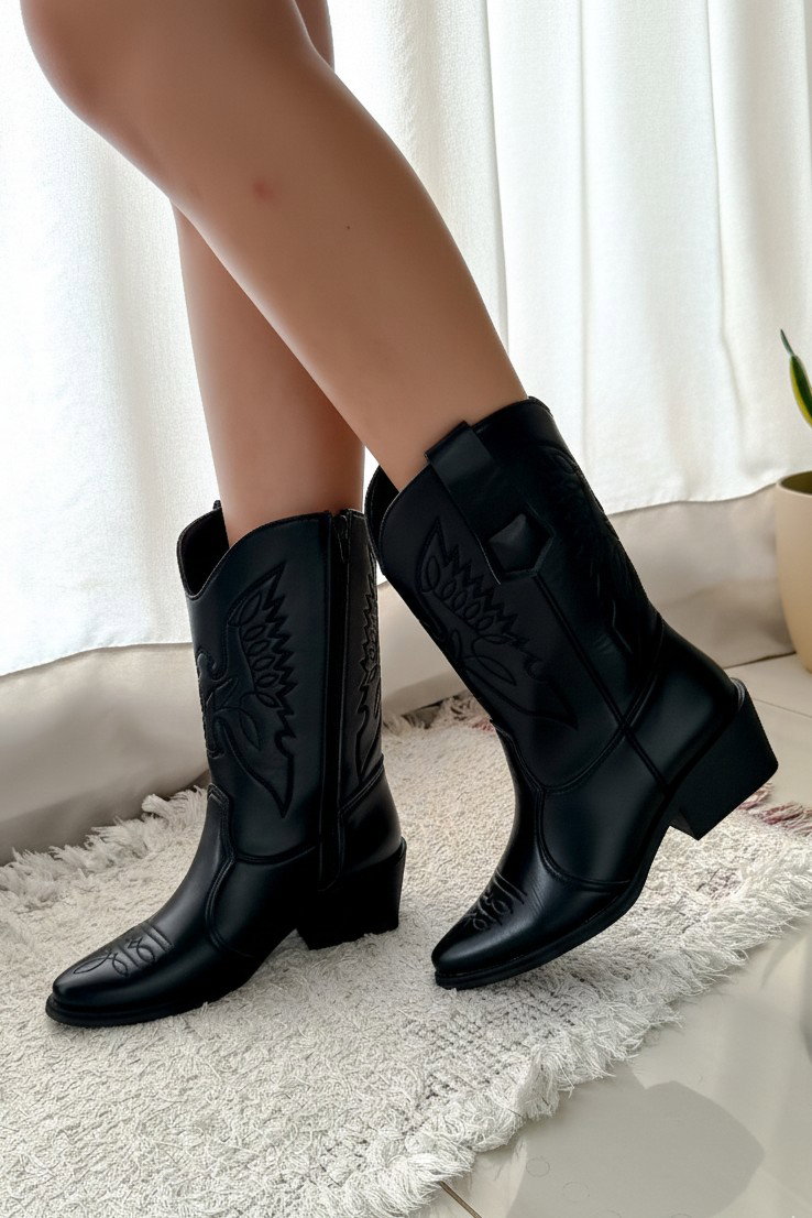 Texana media confeccionada en cuero sintético, con diseño clásico western y costuras decorativas marcadas en la caña y el empeine.