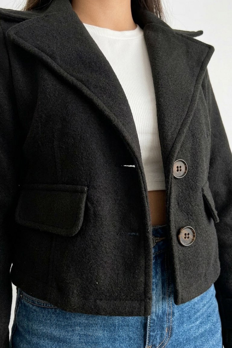 El modelo cuenta con dos botones negros al frente que destacan sobre la prenda y le dan un toque clásico, junto con un cuello con solapa que aporta presencia y estilo. Su diseño es limpio y minimalista, ya que no posee bolsillos, logrando una silueta más prolija.