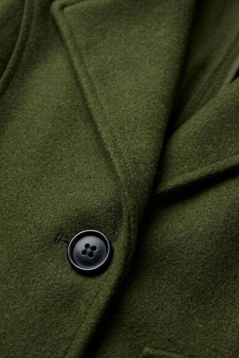 El modelo cuenta con dos botones negros al frente que destacan sobre la prenda y le dan un toque clásico, junto con un cuello con solapa que aporta presencia y estilo. Su diseño es limpio y minimalista, ya que no posee bolsillos, logrando una silueta más prolija.