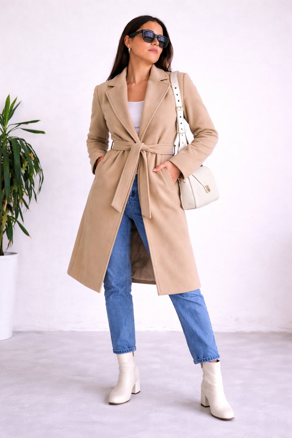 Es un modelo de frente abierto, sin botones visibles al frente, lo que le da una caída prolija y limpia. El lazo permite regular el ajuste en la cintura y resaltar la silueta. Su largo, combinado con el diseño recto y las solapas marcadas, lo convierte en una prenda versátil para usar con jeans, pantalones de vestir, botas o zapatillas.