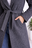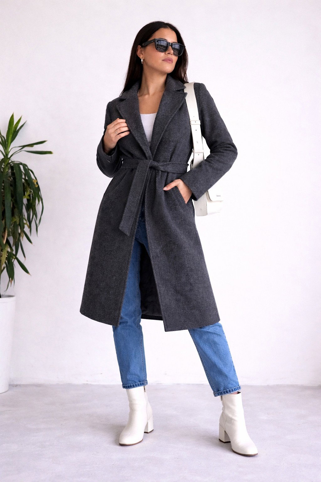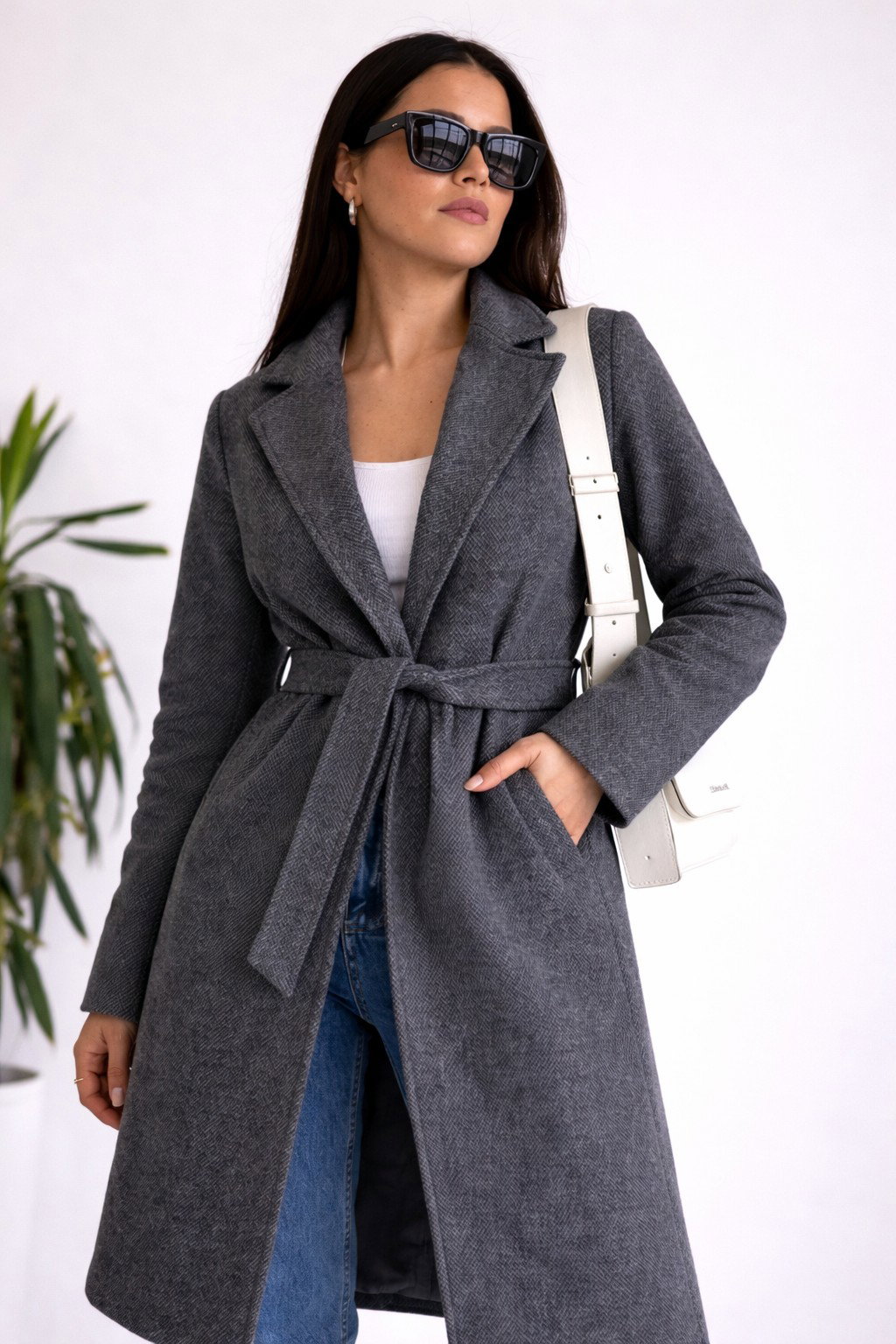 Es un modelo de frente abierto, sin botones visibles al frente, lo que le da una caída prolija y limpia. El lazo permite regular el ajuste en la cintura y resaltar la silueta. Su largo, combinado con el diseño recto y las solapas marcadas, lo convierte en una prenda versátil para usar con jeans, pantalones de vestir, botas o zapatillas.