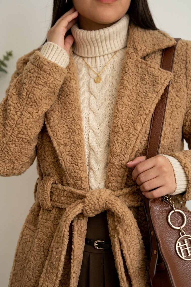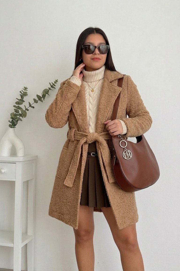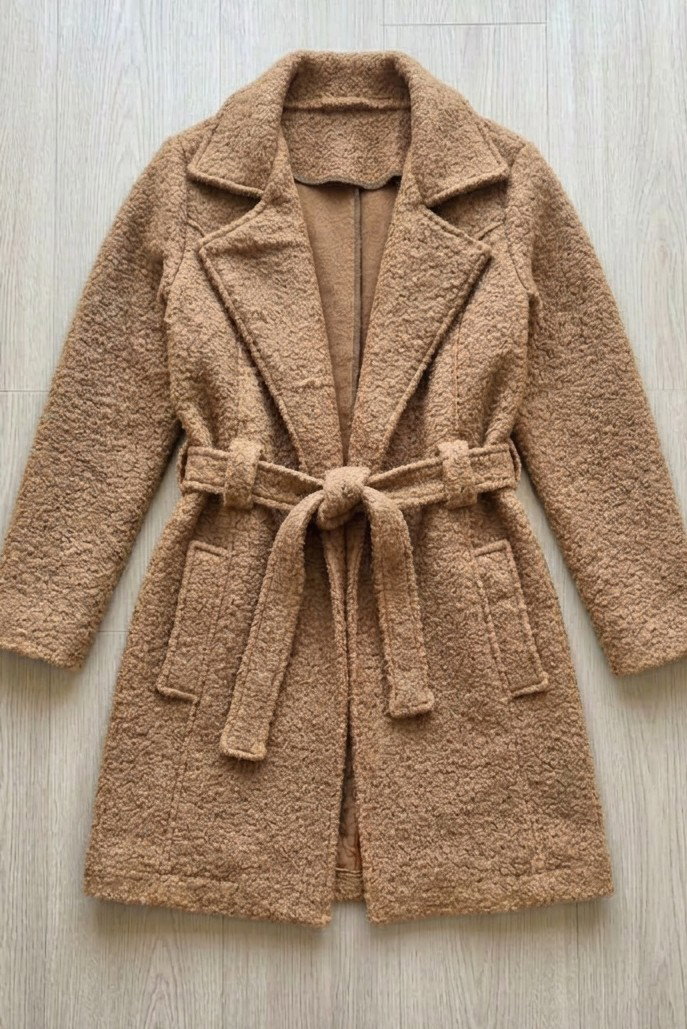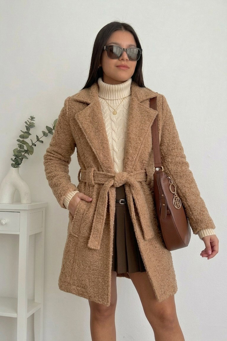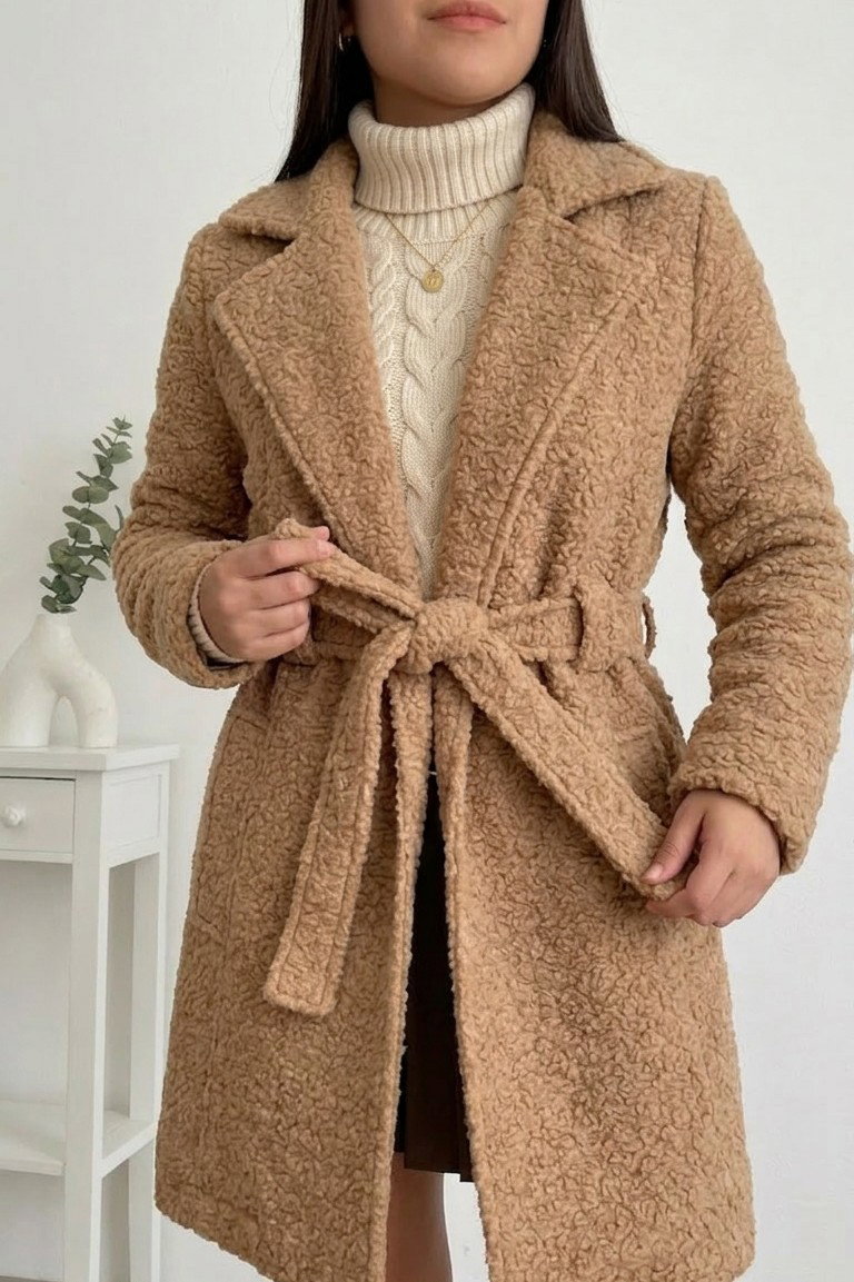 Está confeccionado en paño boucle (efecto corderito), una tela suave, abrigada y con textura, ideal para los días fríos. Además de ser cómodo, aporta volumen y presencia al outfit.
