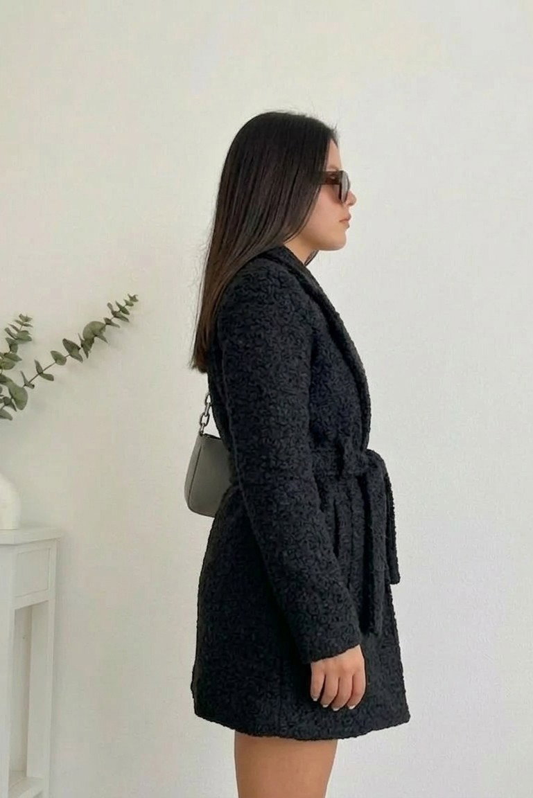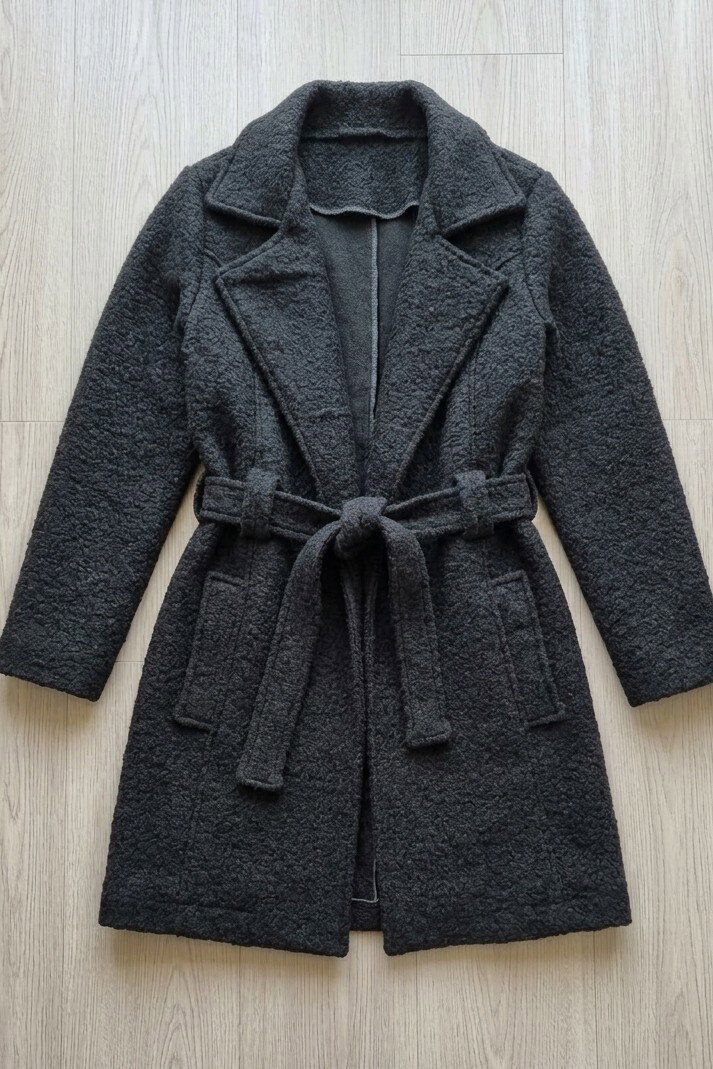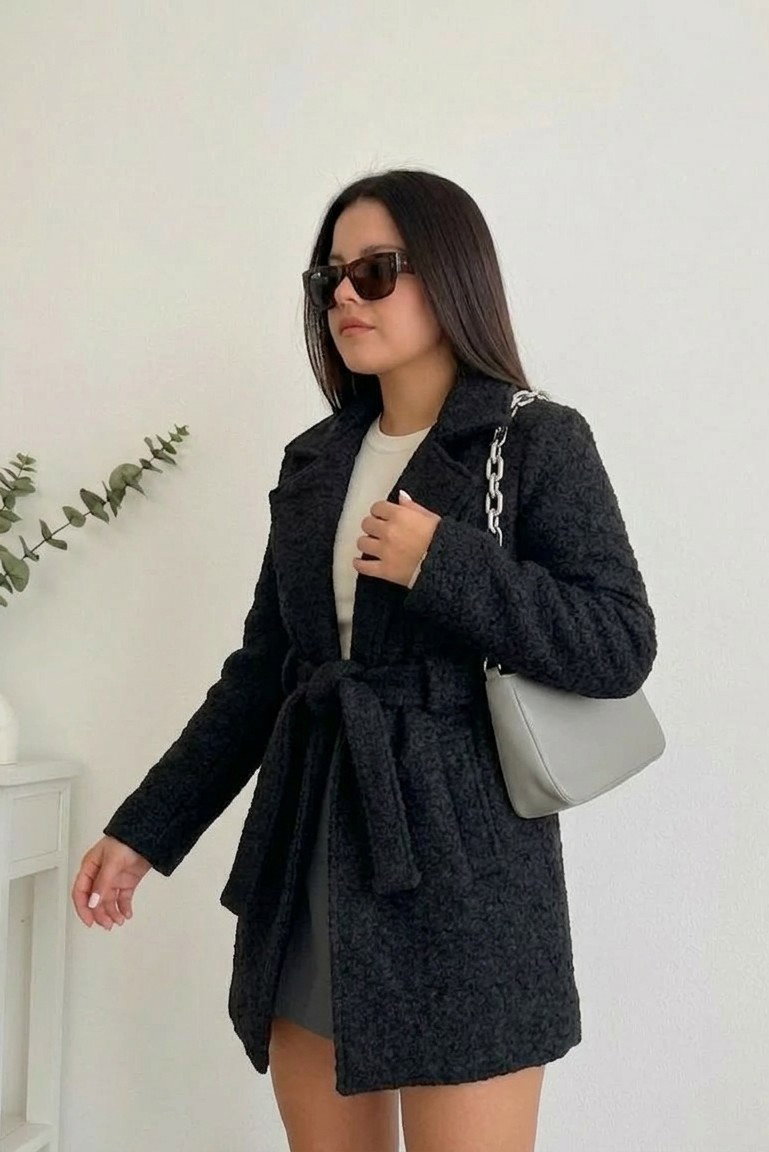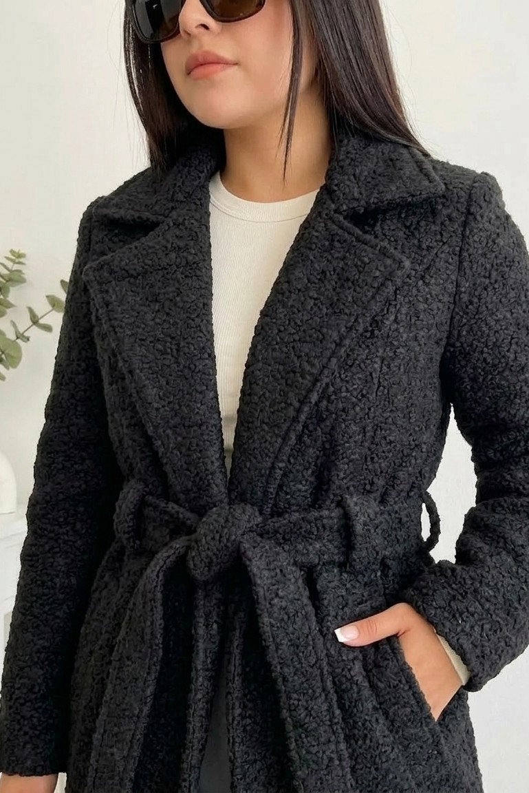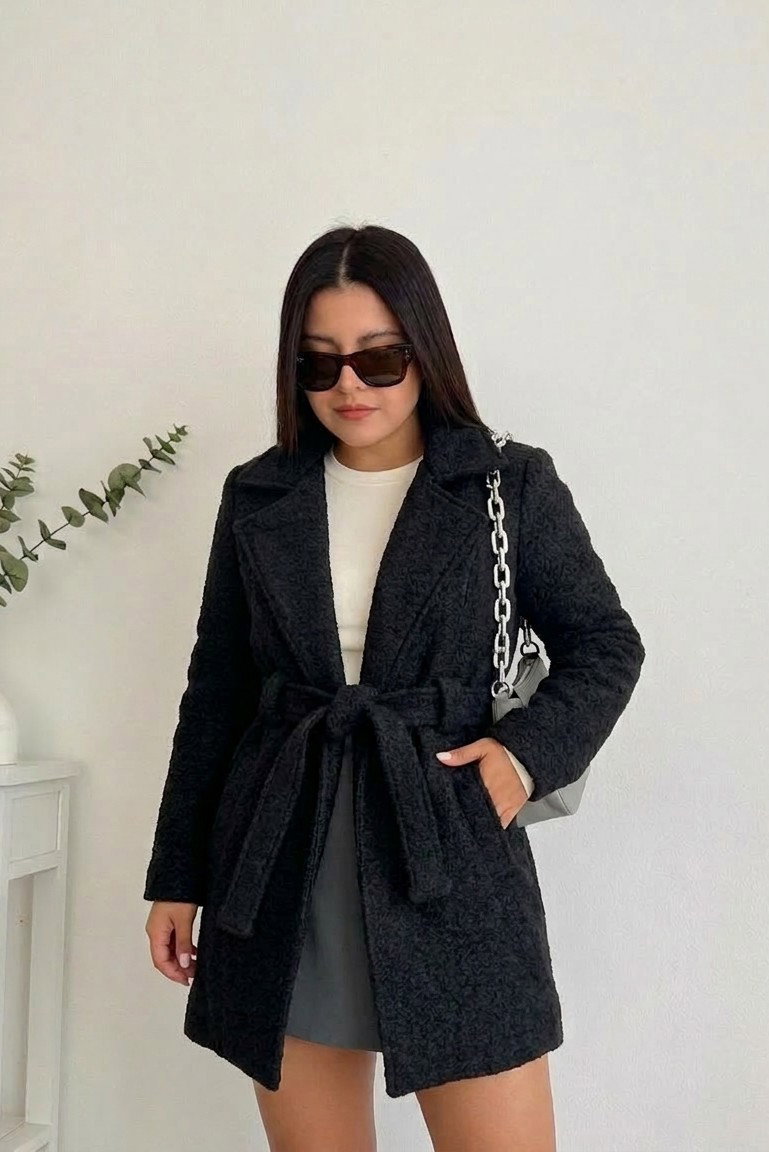 Está confeccionado en paño boucle (efecto corderito), una tela suave, abrigada y con textura, ideal para los días fríos. Además de ser cómodo, aporta volumen y presencia al outfit.