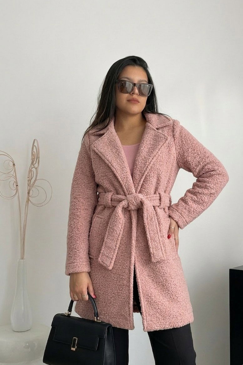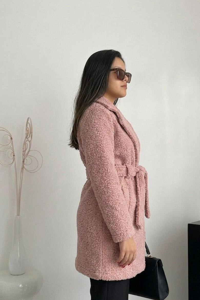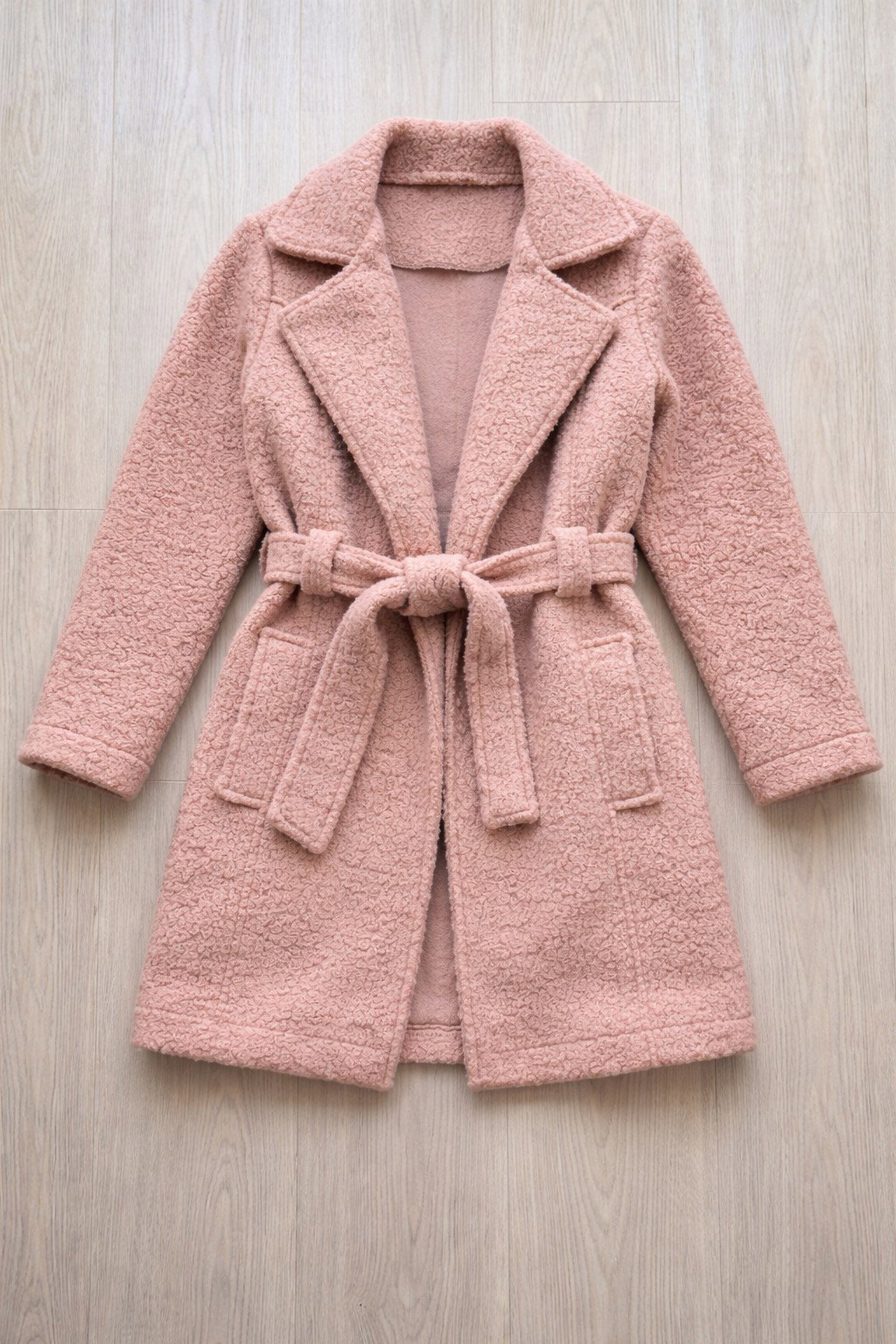 Está confeccionado en paño boucle (efecto corderito), una tela suave, abrigada y con textura, ideal para los días fríos. Además de ser cómodo, aporta volumen y presencia al outfit.