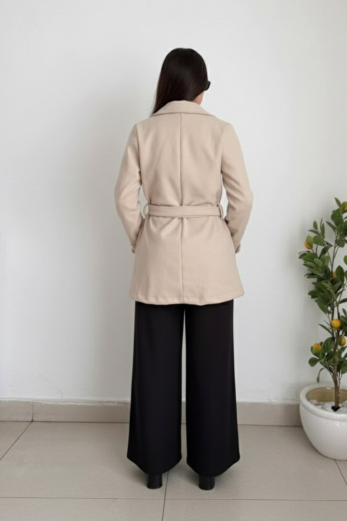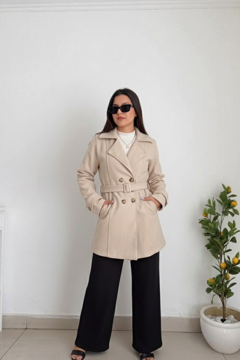 El modelo cuenta con cuello con solapa clásica, botonadura frontal doble con botones importados y bolsillos laterales funcionales, que aportan practicidad sin perder estilo.