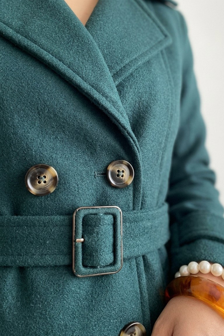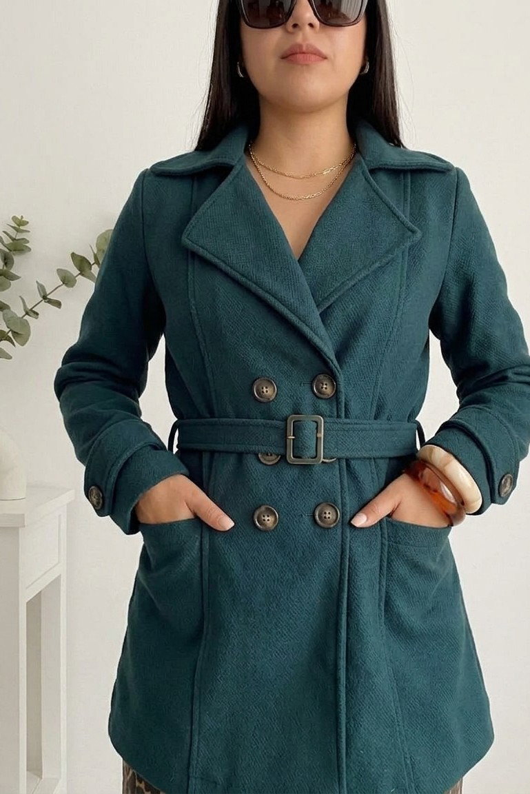 El modelo cuenta con cuello con solapa clásica, botonadura frontal doble con botones importados y bolsillos laterales funcionales, que aportan practicidad sin perder estilo.